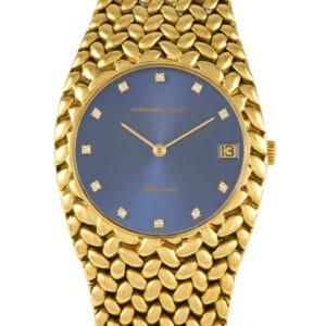 Audemars Piguet’s ref.5403, or the Cobra, was only made available in yellow or white gold. This 18K yellow gold variation boasts an attractive sunburst blue dial set with diamond hour markers mounted on square-shaped yellow gold frames. The uncluttered face of the watch also features slim hour and minute hands, and a date window at 3 o’clock. The meticulously crafted bracelet has an integrated 34mm case that houses the ultra-thin caliber 2121 automatic movement that powers this timepiece.