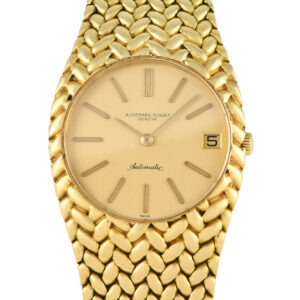 Don’t miss out on the opportunity to own this vintage Audemars Piguet ref.5403 with a substantial weight and an equally substantial wrist presence. It boasts a 34mm case that flawlessly integrates into a braided yellow gold bracelet that evokes the scales of a cobra snake. A neat and uncluttered champagne linen dial with slender hands and stick hour markers beautifully balances the flashy full yellow gold construction. The date window sits at the 3 o’clock position. Inside the watch is caliber 2121, an ultra-thin self-winding movement with a 2.8 Hz frequency and a 40-hour power reserve.