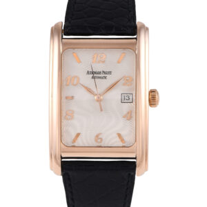 Similar to the timepieces in the Edward Piguet line, this time-and-date wristwatch features an elegantly arched case flank in a high-polish finish. The sides of the rose gold rectangular case have a brushed finish. The beautiful silver guilloche dial is detailed with rose gold leaf-shaped hands plus alternating applied index and Arabic numeral hour markers. The watch is powered by caliber 2140 automatic movement, which has 31 jewels and an approximate power reserve of 40 hours. It has a black leather strap with a rose gold tang clasp.