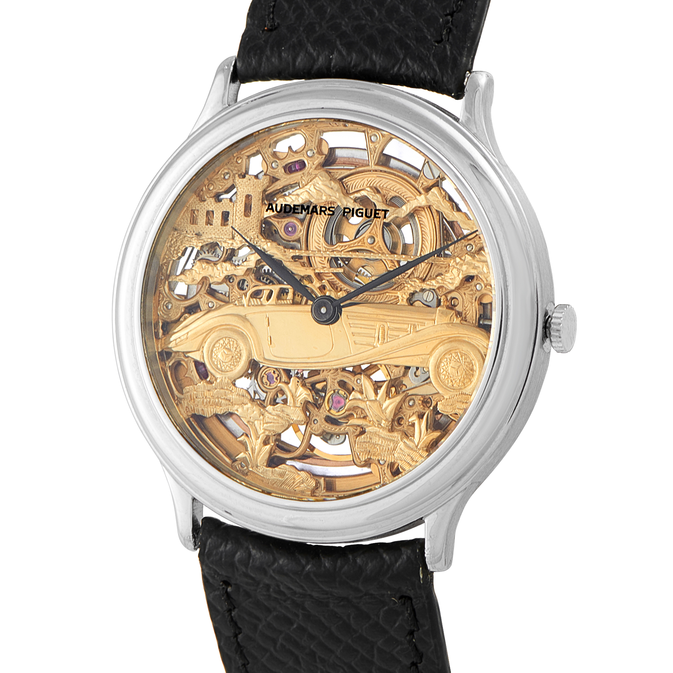 A true collector’s gem. The Audemars Piguet Mercedes-Benz 500K Roadster features a 33.5mm platinum case paired with a classic leather strap and platinum buckle. Its standout feature is the skeletonized gold dial, meticulously sculpted to depict the iconic 1930s roadster in stunning relief. The miniature work of art on the watch’s face transforms timekeeping into storytelling. The watch is powered by Caliber 2120/2, an automatic time-only movement with 40 hours of power reserve.