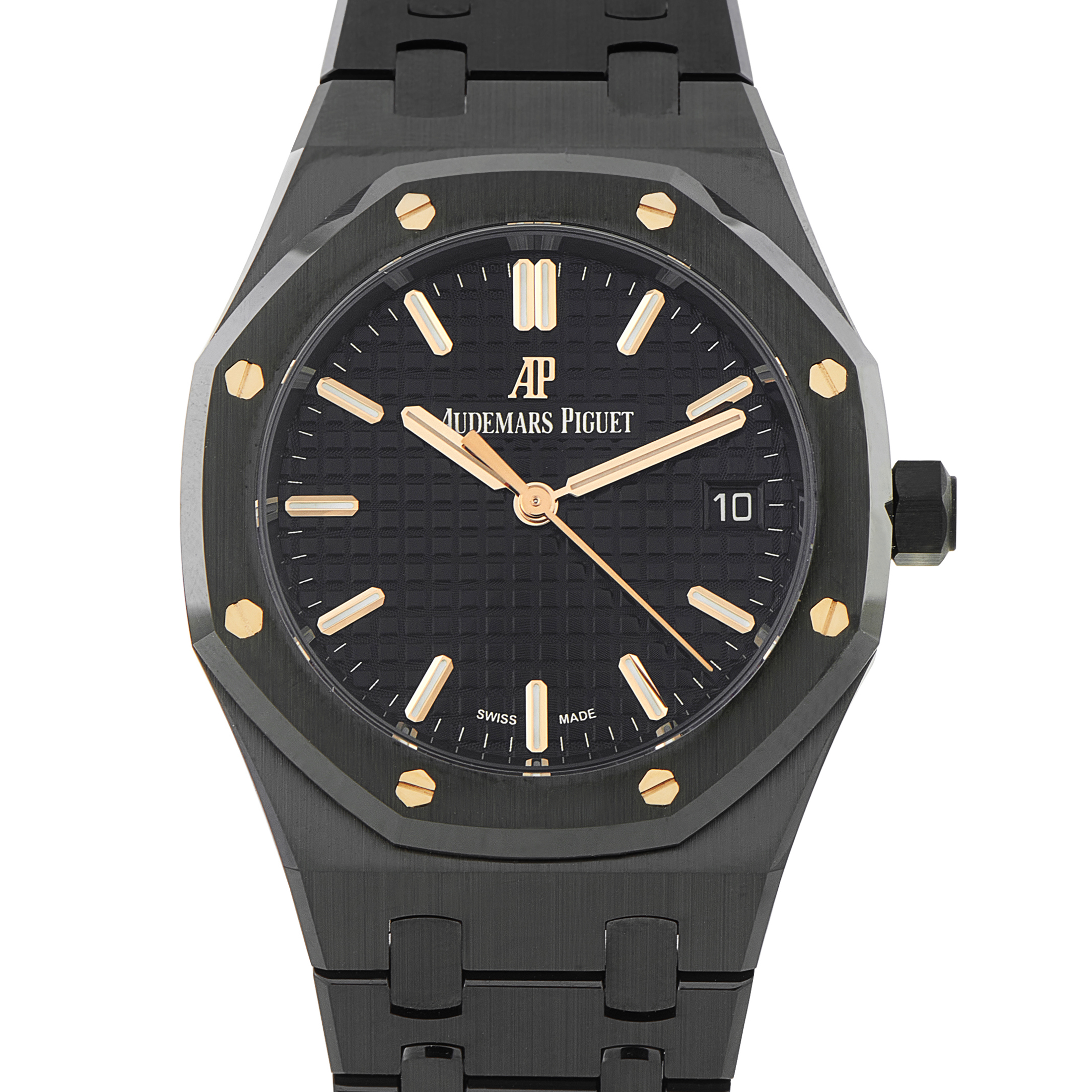 In sleek, monochromatic black ceramic, this Royal Oak ref. 77350CE stands as a powerful and sophisticated statement piece. It’s incredibly light, durable, and virtually scratch-resistant. Its versatile 34mm case and time-and-date complication make it an ideal everyday companion. The watch’s black Grande Tapisserie dial, detailed with warm rose gold applied markers, highlights its signature aggressive yet elegant presence. Driving the watch is the precise Caliber 5800 automatic movement, which delivers a reliable 50-hour power reserve.