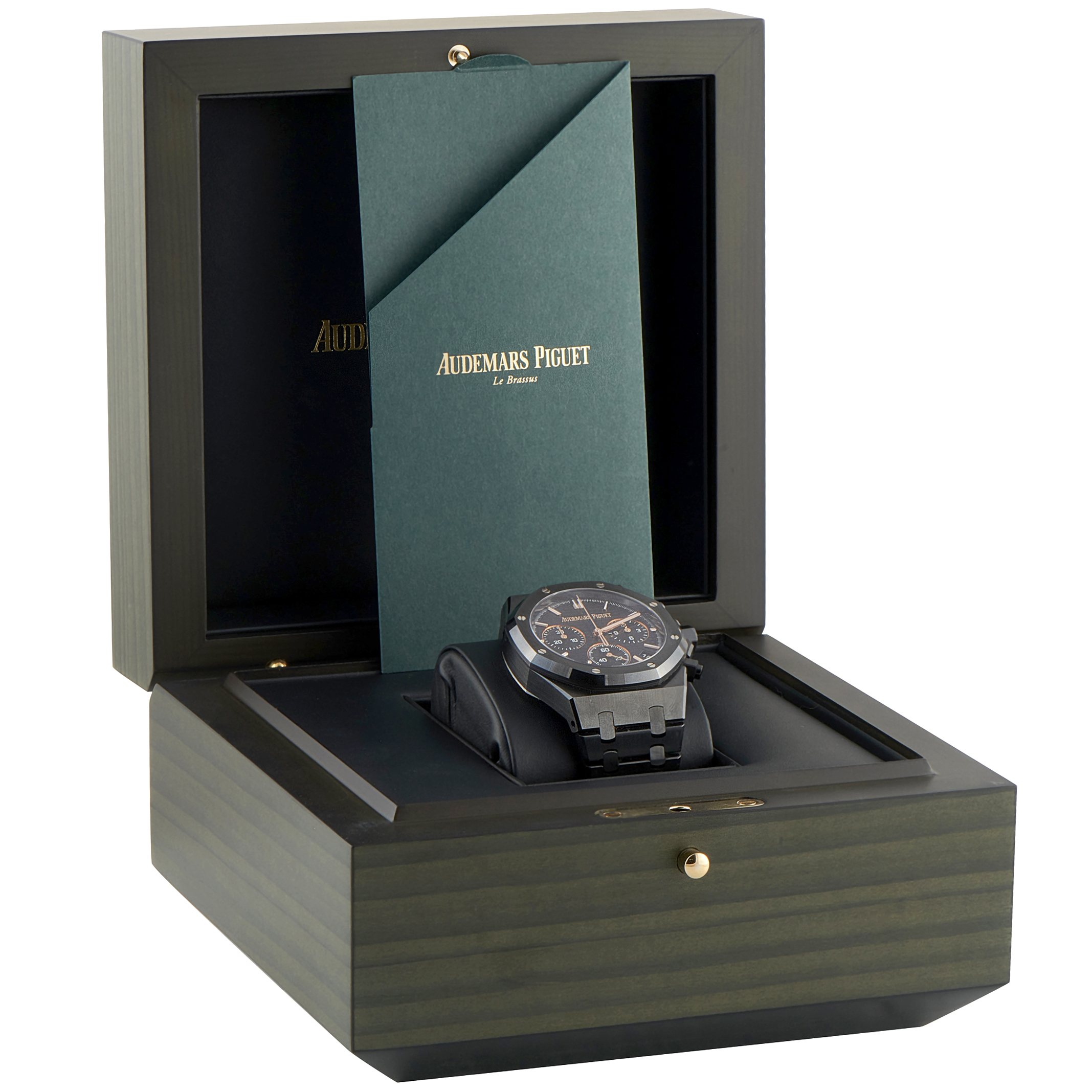 This is a pre-owned Audemars Piguet Royal Oak Chronograph Black Ceramic Watch 26240CE.OO.1225CE.02, accompanied by papers and the manufacturer’s box.