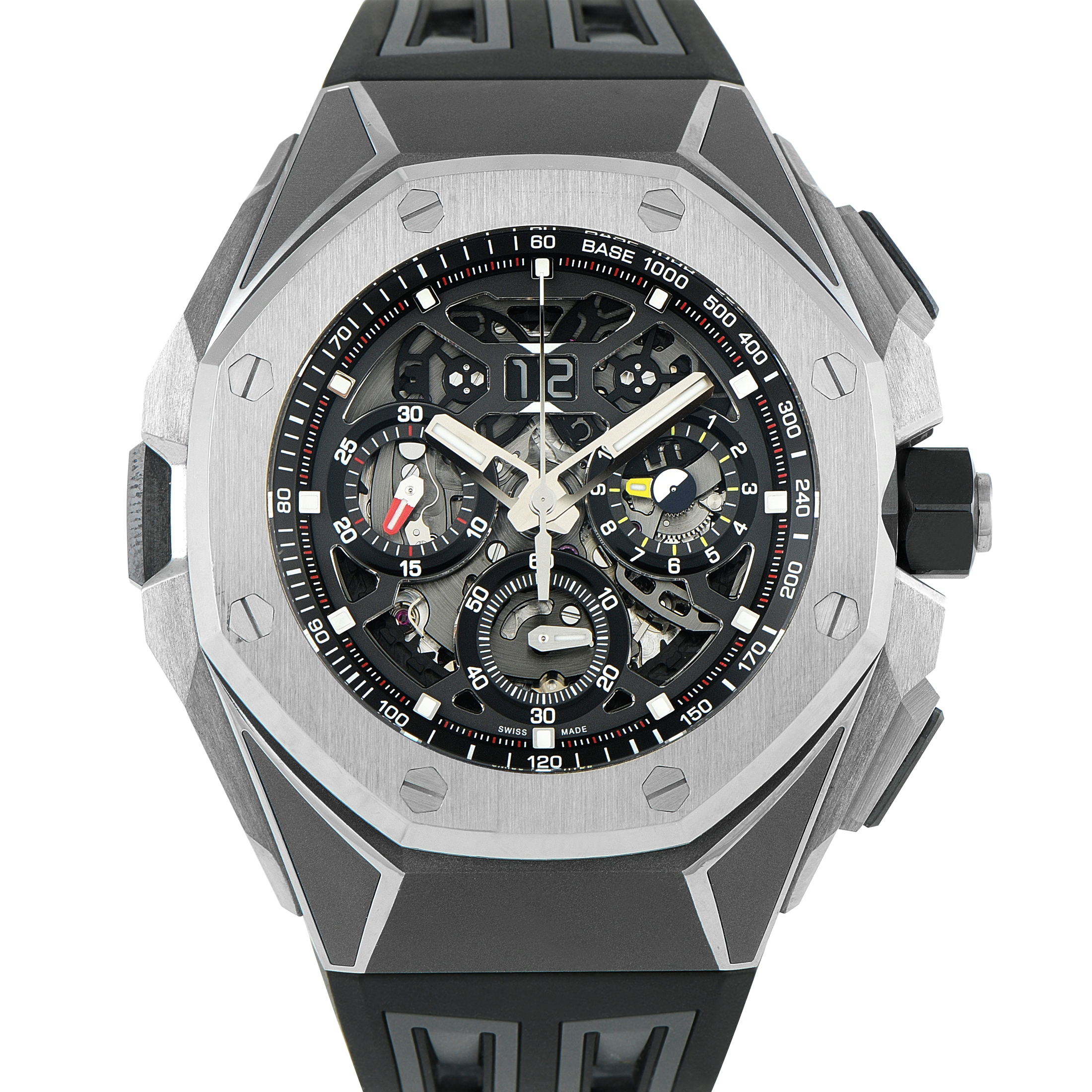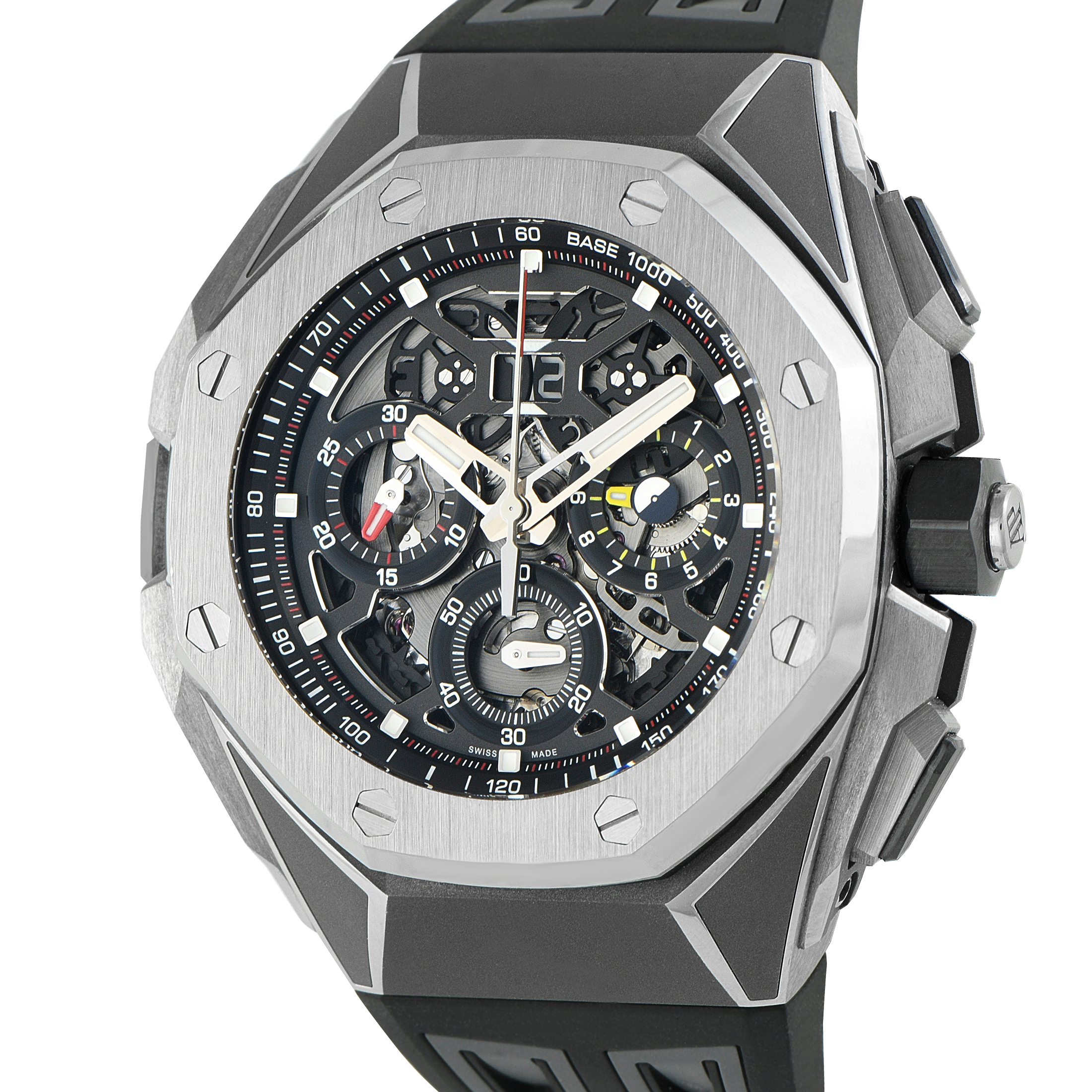 For watch lovers who value innovation and modern engineering, here is Audemars Piguet’s ref. 26650TI.OO.D013CA.01. It presents futuristic aesthetics with its open-worked dial set within a lightweight titanium case that’s paired with modular rubber straps. Equipped with Caliber 4407, the watch delivers a flyback split-seconds chronograph along with GMT and big date functions, all visible through the intricately skeletonized dial.