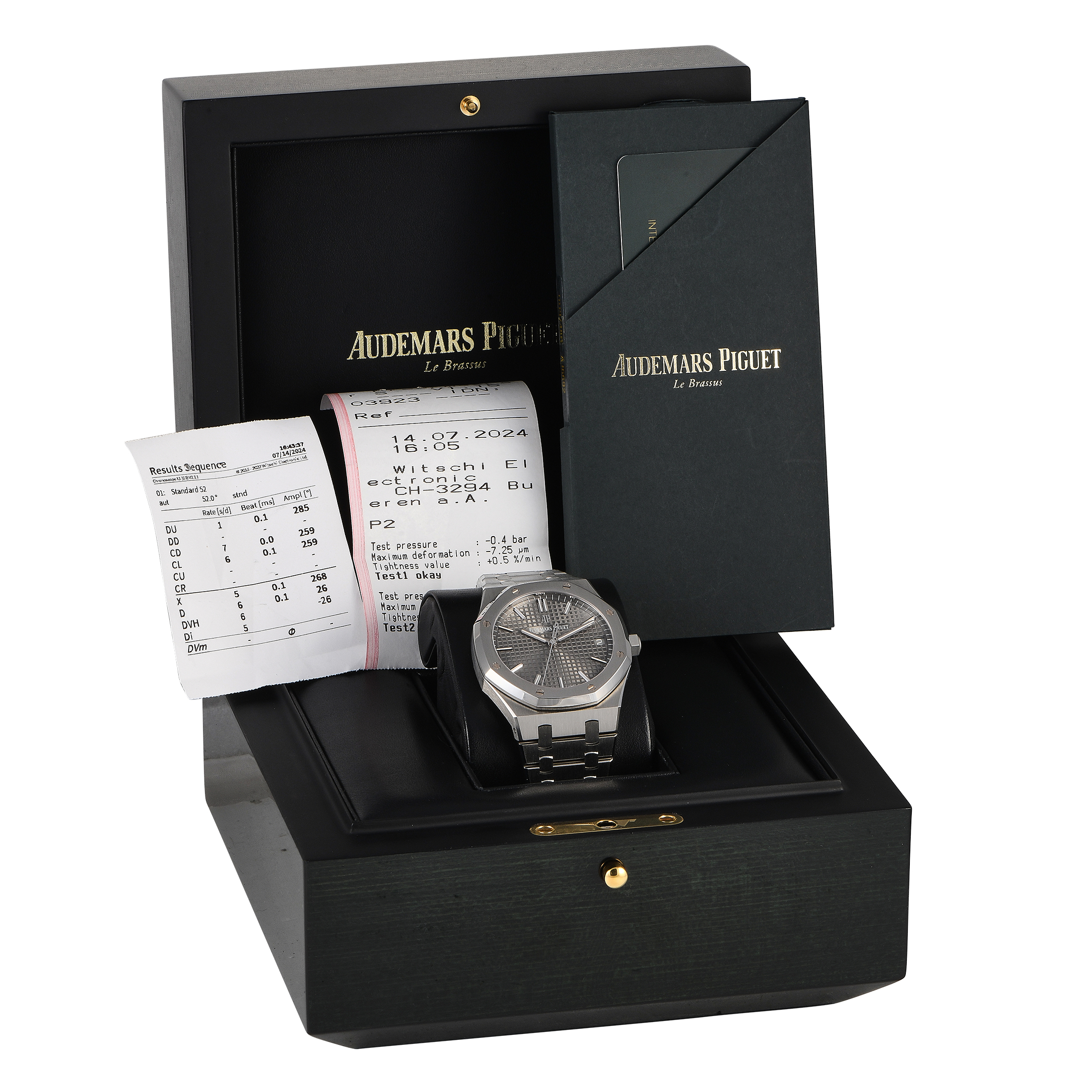 This pre-owned Audemars Piguet Royal Oak Grey Dial Watch 15500ST.OO.1220ST.02 comes with papers and the manufacturer’s box.