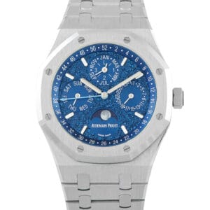The Audemars Piguet ref. 26574BC.OO.1220BC.02 is a limited edition Royal Oak Perpetual Calendar designed in collaboration with John Mayer. It is crafted entirely from 18K white gold, with a 41mm case and integrated bracelet. The centerpiece is the “Crystal Sky” dial in deep blue, featuring an embossed pattern that catches light in a celestial and architectural way. Inside beats the self-winding caliber 5134, offering displays for the day, date, month, leap year, week indication, and moon phase. Only 200 pieces of this reference were made.
