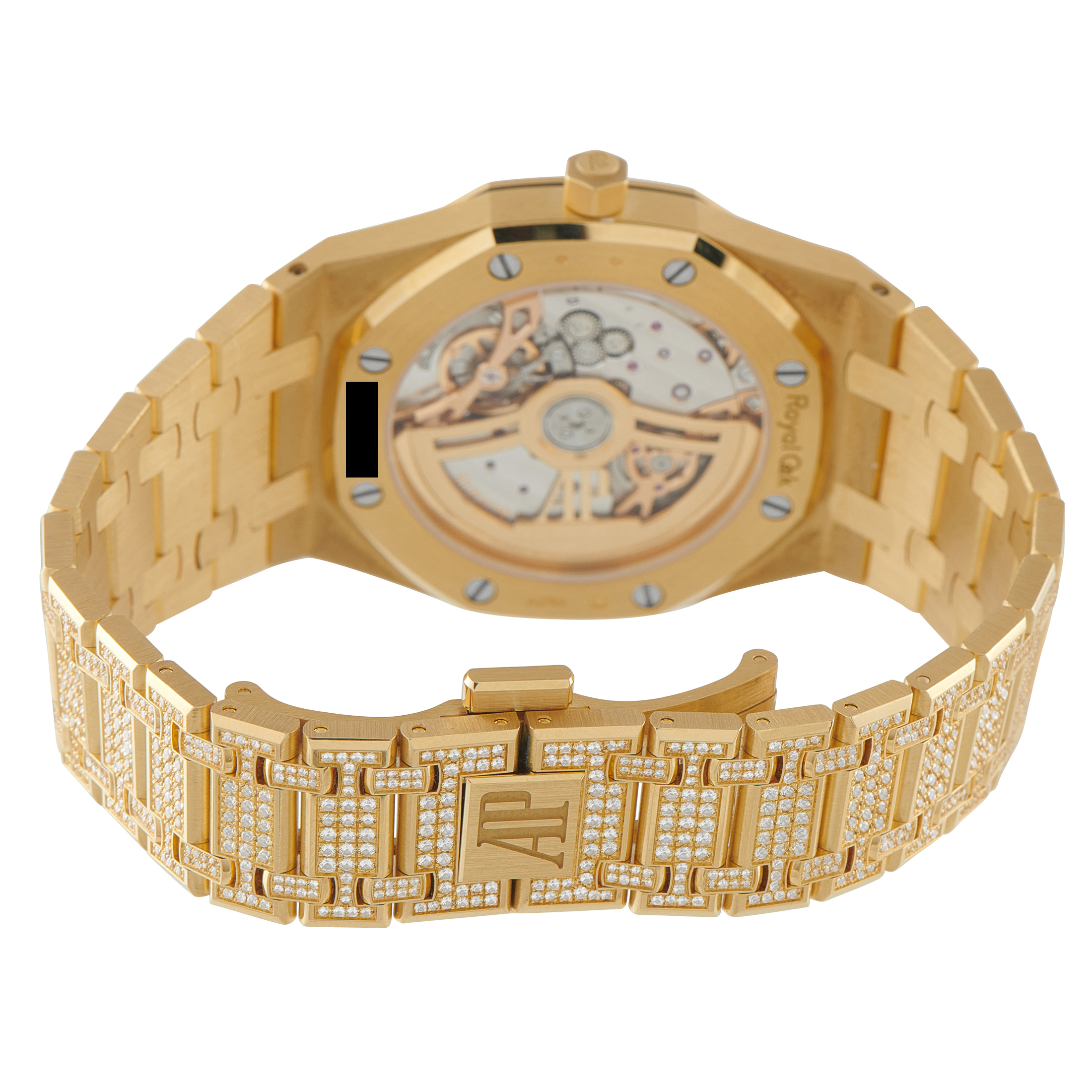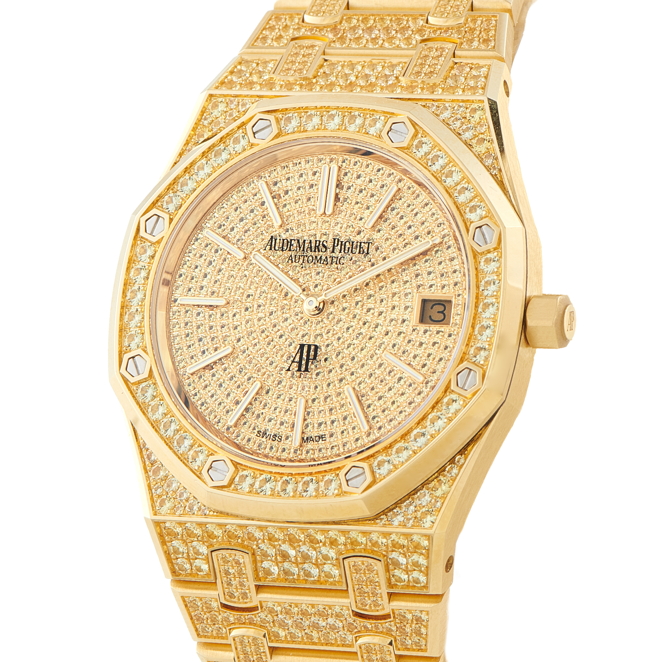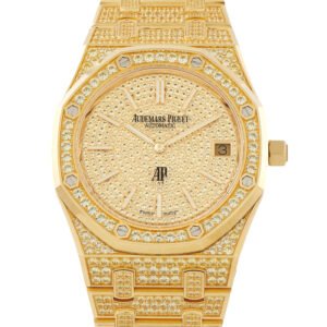 The Royal Oak Jumbo 16202BA.HH.1241BA.01 pushes the limits of gem-set watchmaking. Rather than using stones as mere accents, this reference integrates them into the watch’s entirety. Brilliant-cut yellow sapphires cover the 39mm yellow gold case, octagonal bezel, and bracelet. The dial continues this theme with a circular pavé of the same stones, providing a backdrop for the luminous markers and hands.