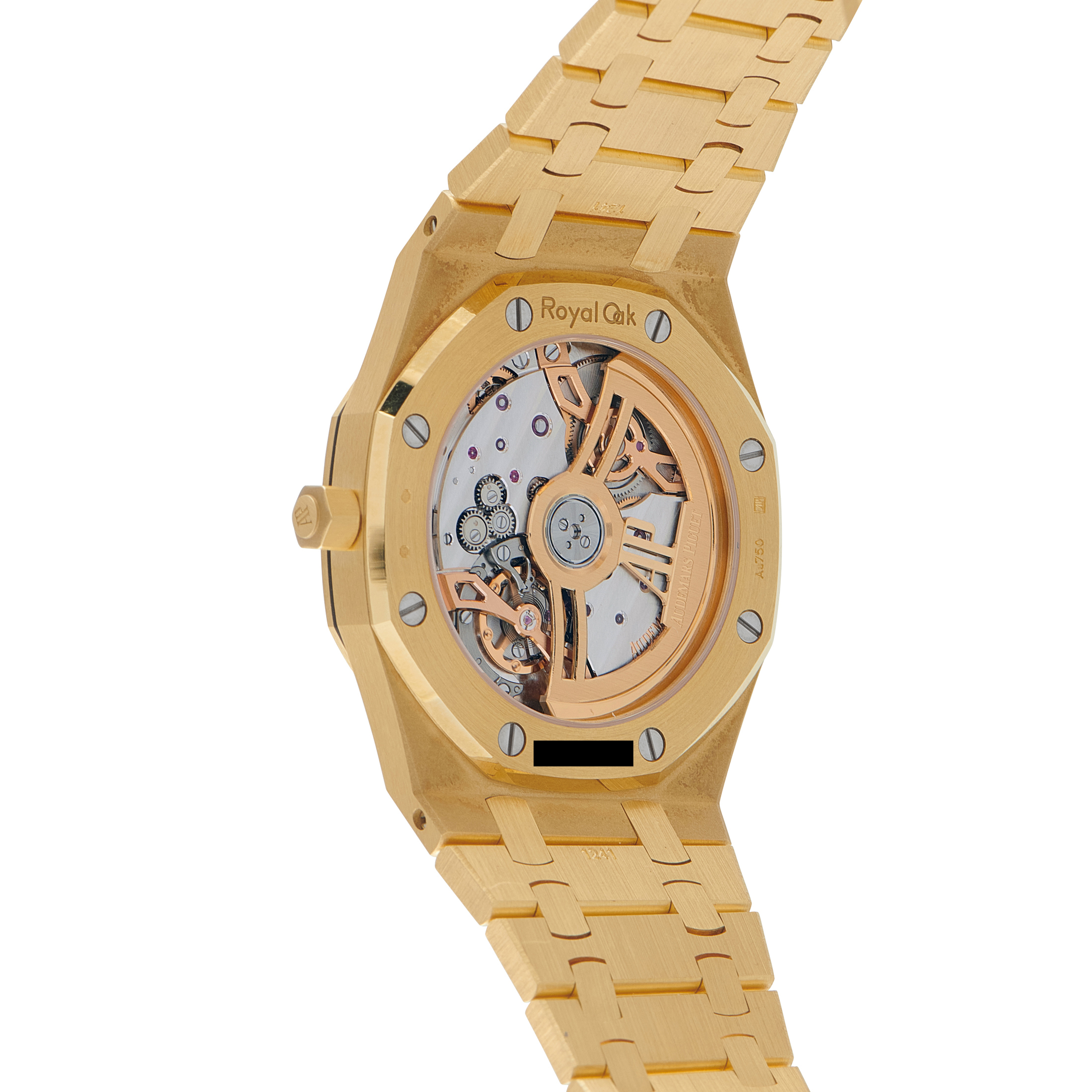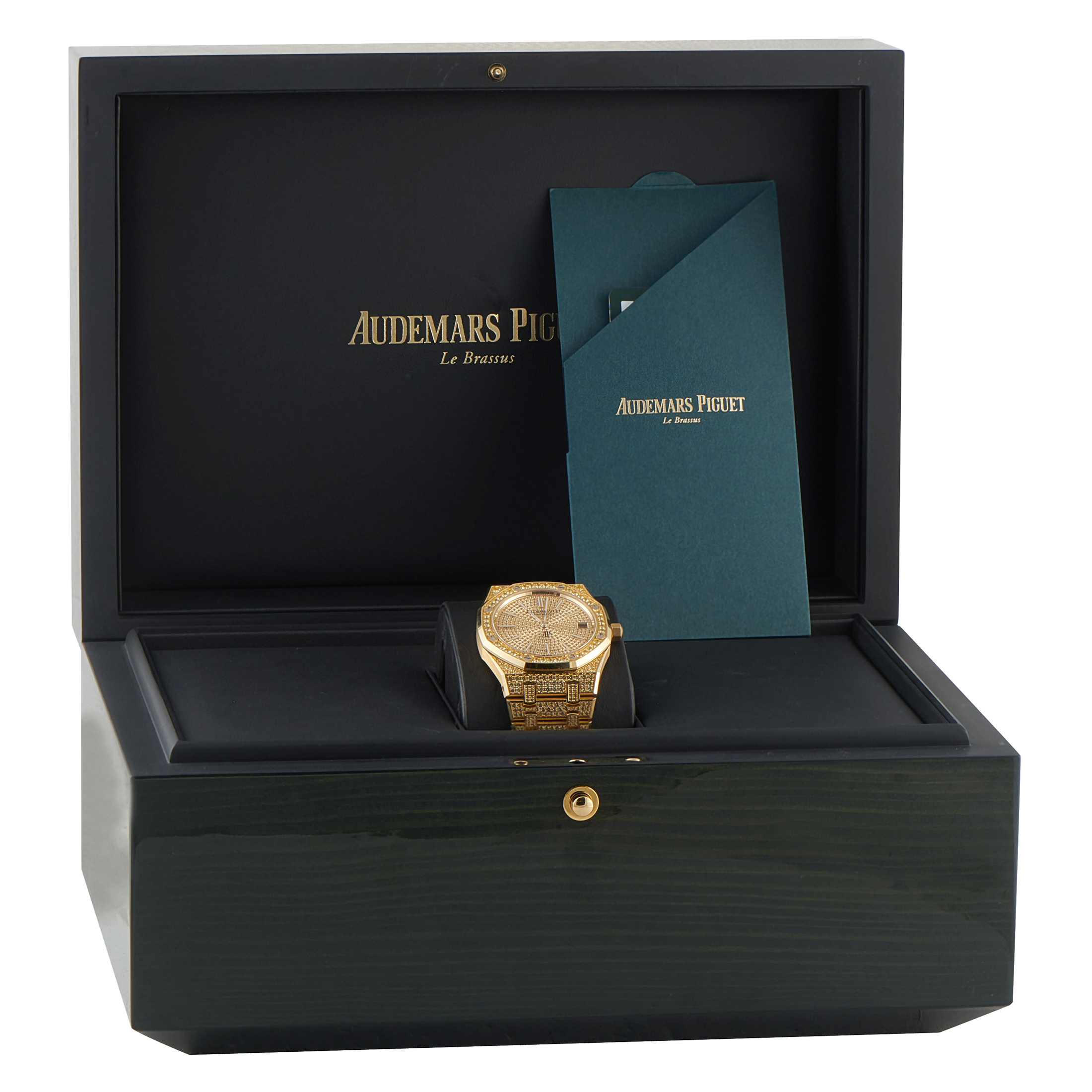 Papers and the manufacturer’s box accompany this pre-owned Audemars Piguet Royal Oak Jumbo Extra-Thin Sapphire and Yellow Gold Watch 16202BA.HH.1241BA.01.