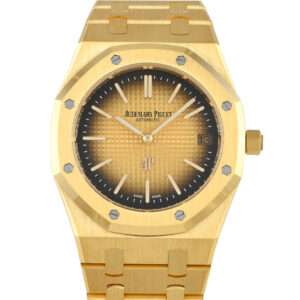 A boldly styled luxury wristwatch that will draw eyes and spark conversations. The Royal Oak Jumbo Extra-Thin has a yellow gold case measuring 39mm in diameter and 8.1mm in height. It has the brand’s signature octagonal bezel with eight hexagonal bolts. The watch presents a “Petite Tapisserie” dial in a unique smoked yellow-gold tone, where the warm gold darkens to black as it moves toward the dial’s perimeter. The slim hour markers and hands have a luminescent fill. A black-on-gold date window sits at the 3 o’clock position. The slim automatic movement, caliber 7121, that powers the watch can be viewed from the sapphire case back.