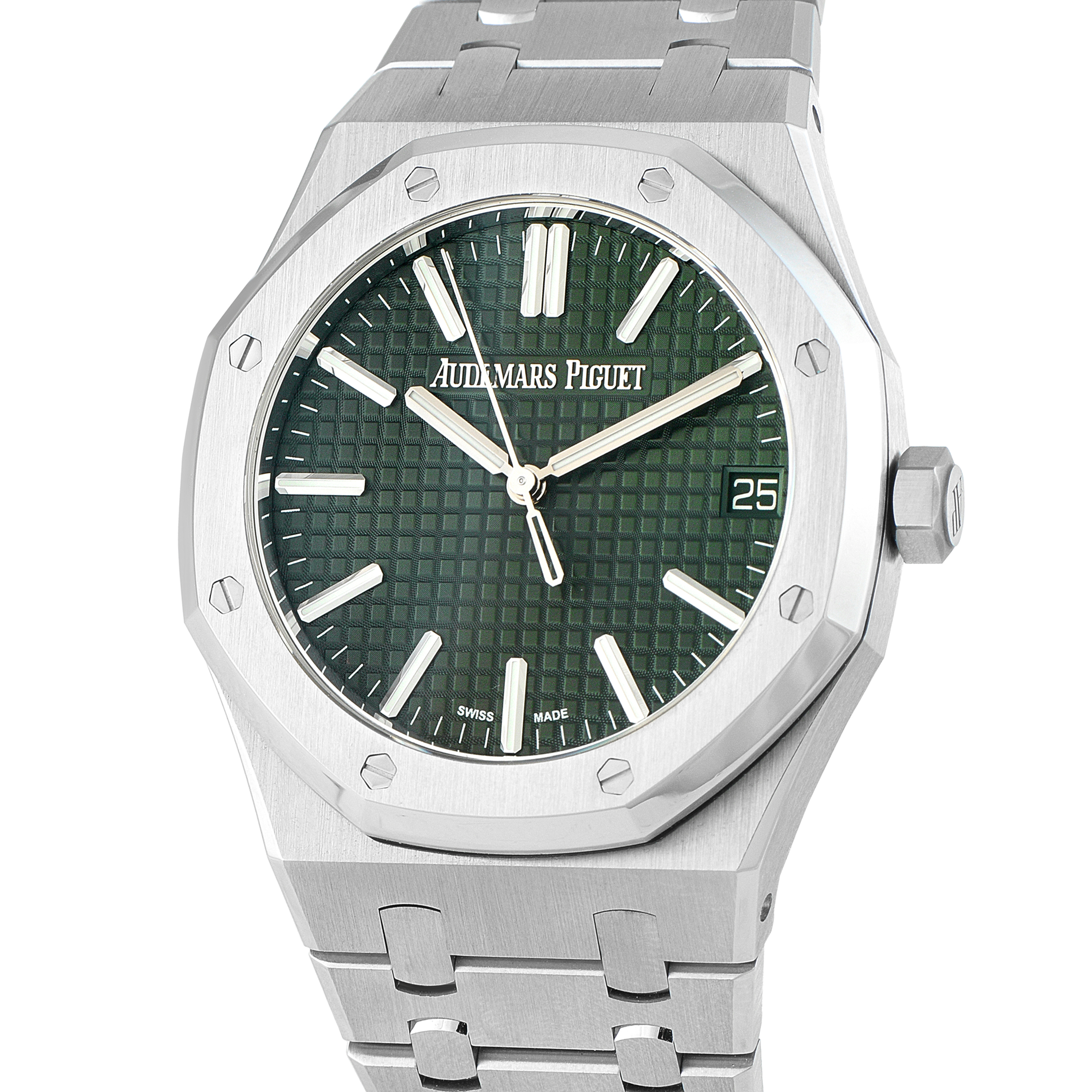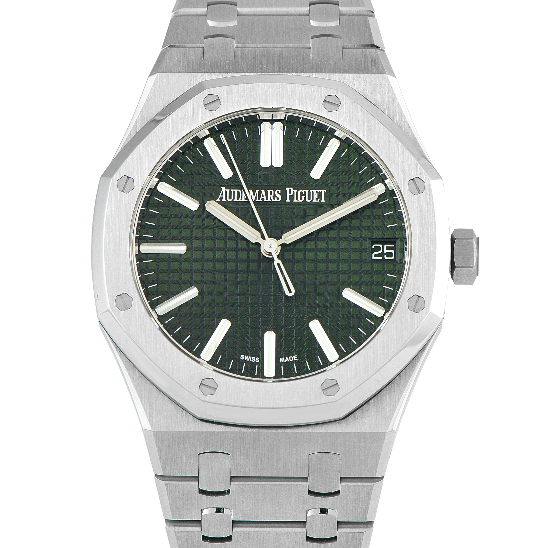 A modern icon, this Royal Oak 41 presents a khaki Grande Tapisserie dial that lends an earthy edge to its sport-luxury profile. The dial’s finely patterned surface enhances both depth and legibility, giving the watch’s face a crisp and sophisticated character. Inside the steel case with its signature octagonal bezel beats the self-winding caliber 4302, powering the watch with precision and a long 70-hour power reserve.