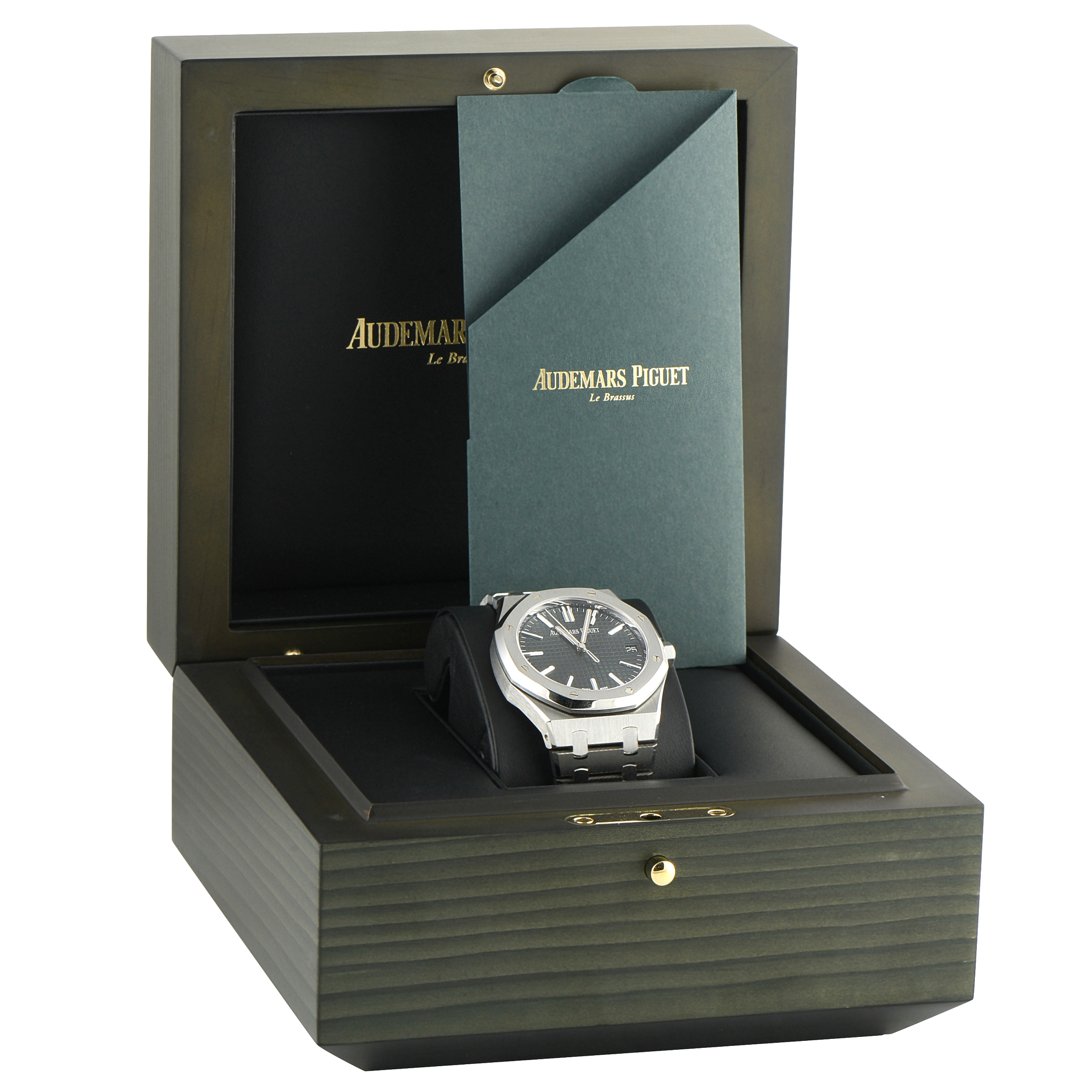 This is a pre-owned Audemars Piguet Royal Oak 41 Khaki Dial Steel Watch 15510ST.OO.1320ST.09. It is accompanied by papers and the manufacturer’s box.