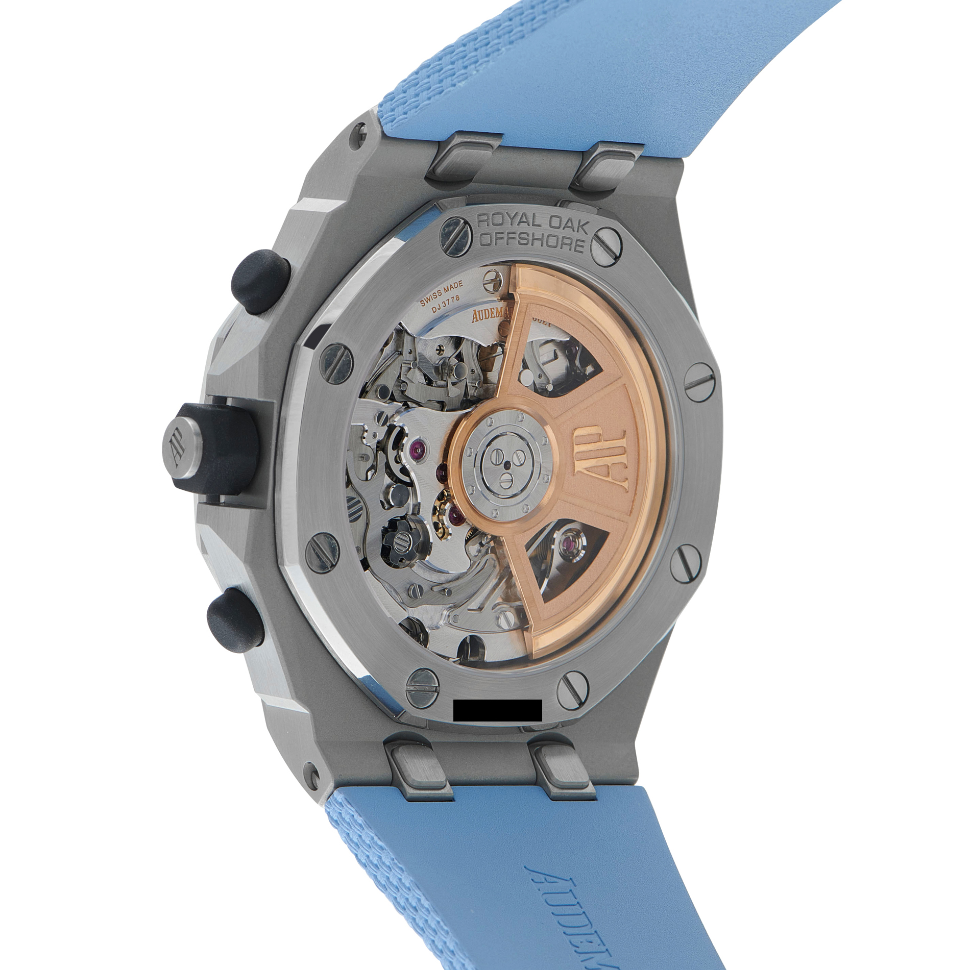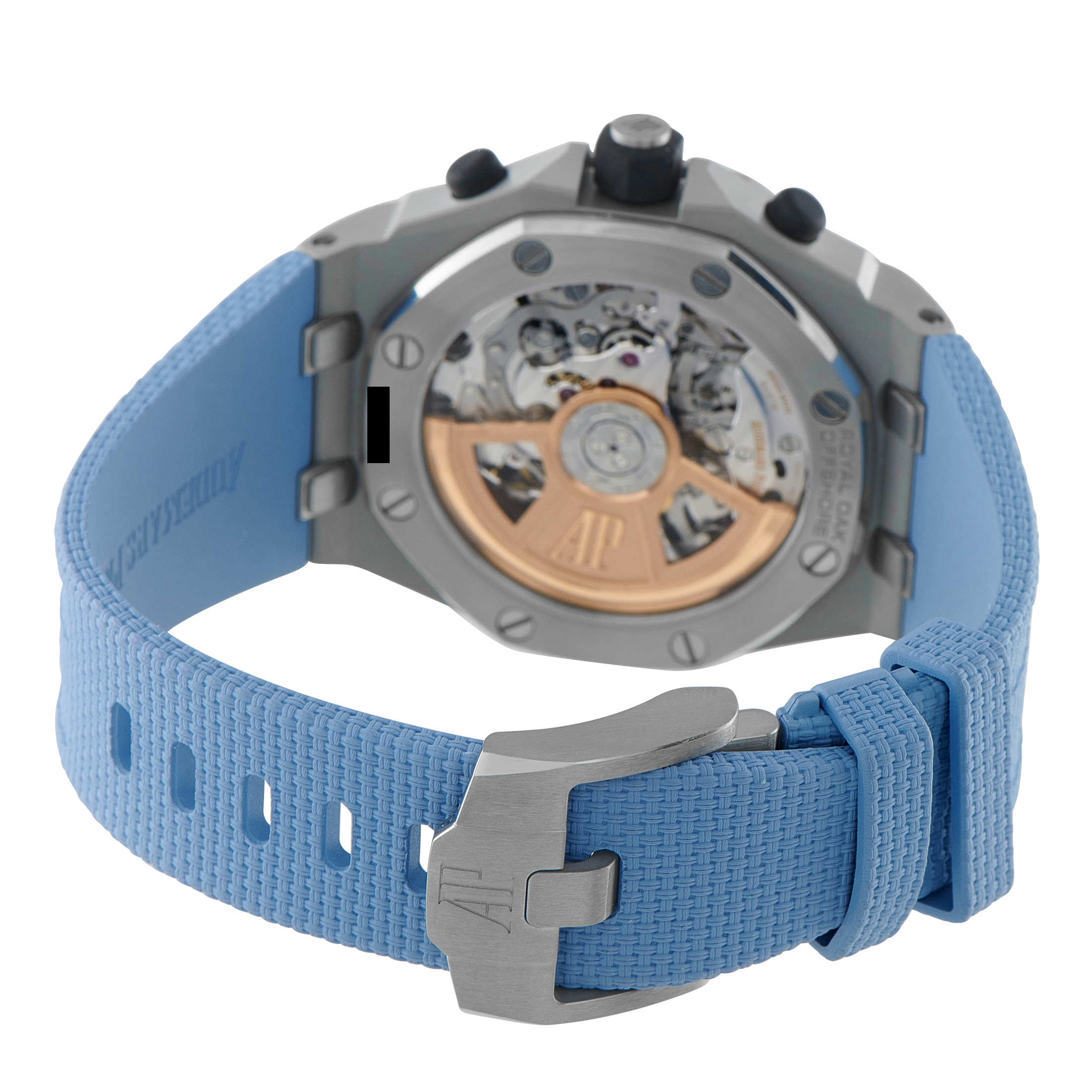 This Offshore refines power through clarity. A sky blue Mega Tapisserie dial sets the tone, layered with black chronograph registers for contrast. The seel case carries the familiar Offshore weight, paired with a textured blue rubber strap that changes easily via AP’s quick-change system. The in-house Caliber 4404 runs an integrated flyback chronograph with a 70-hour power reserve.