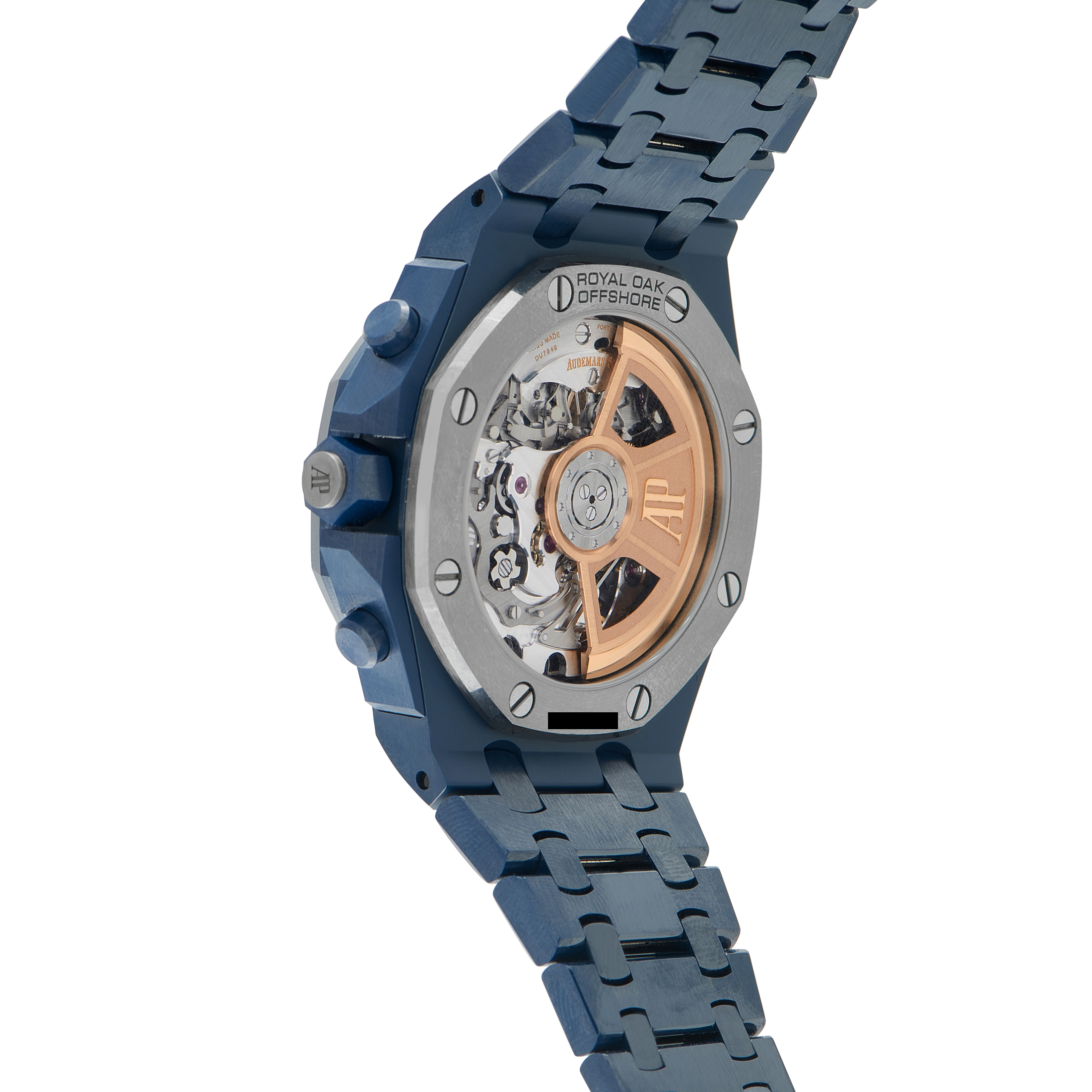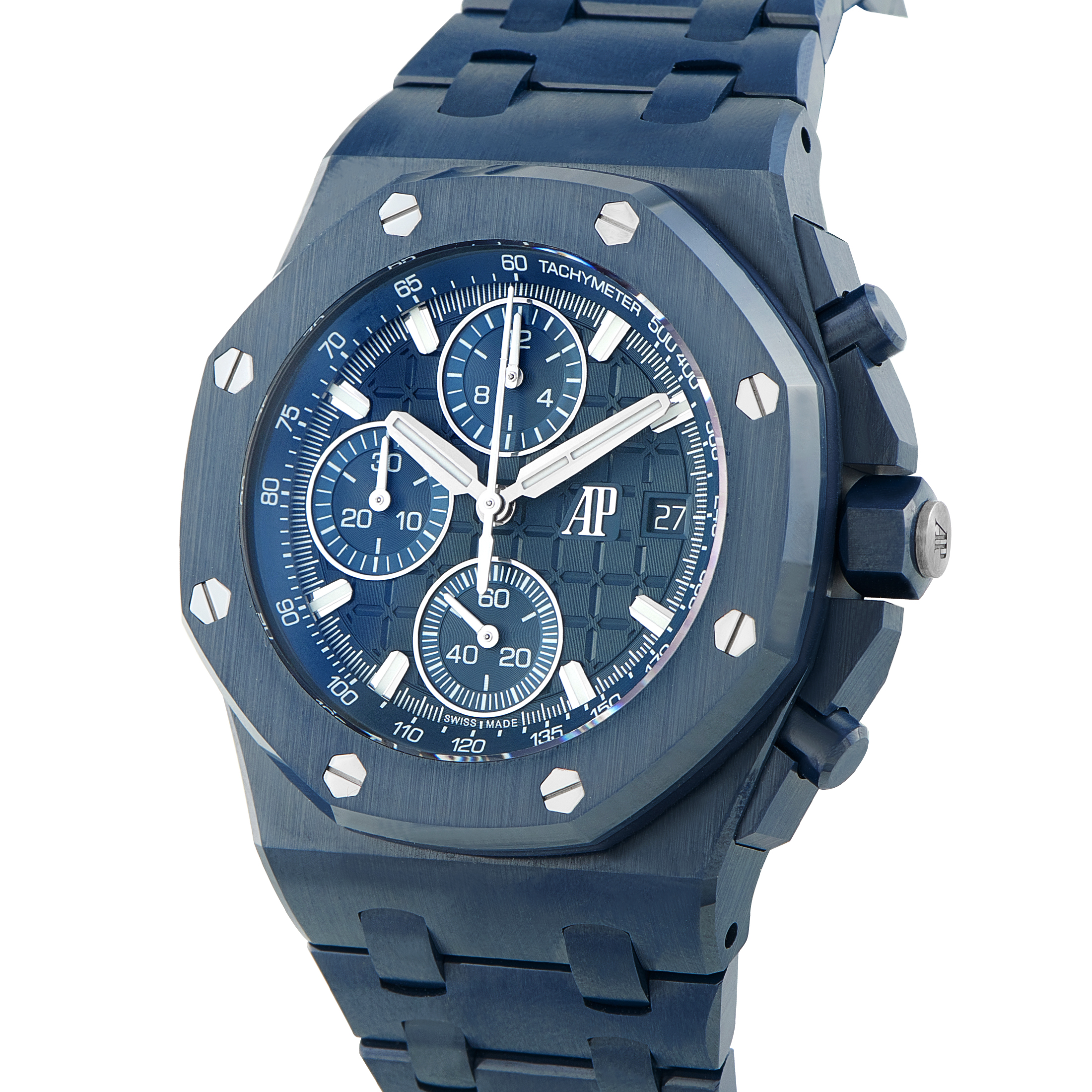 Crafted entirely in Bleu Nuit, Nuage 50 ceramic, this Royal Oak Offshore stands as a forward marker. The monochromatic color is deep and deliberate, giving the watch a sense of lasting presence. The case, bezel and bracelet share the same ceramic finish, creating a continuous surface that emphasizes form over contrast. At 42mm, it remains assertive, yet the weight is controlled and the wear comfortable. The dial mirrors the blue exterior, with white gold hands and markers cutting cleanly through the blue. A self-winding flyback chronograph movement, Caliber 4404, powers the watch.