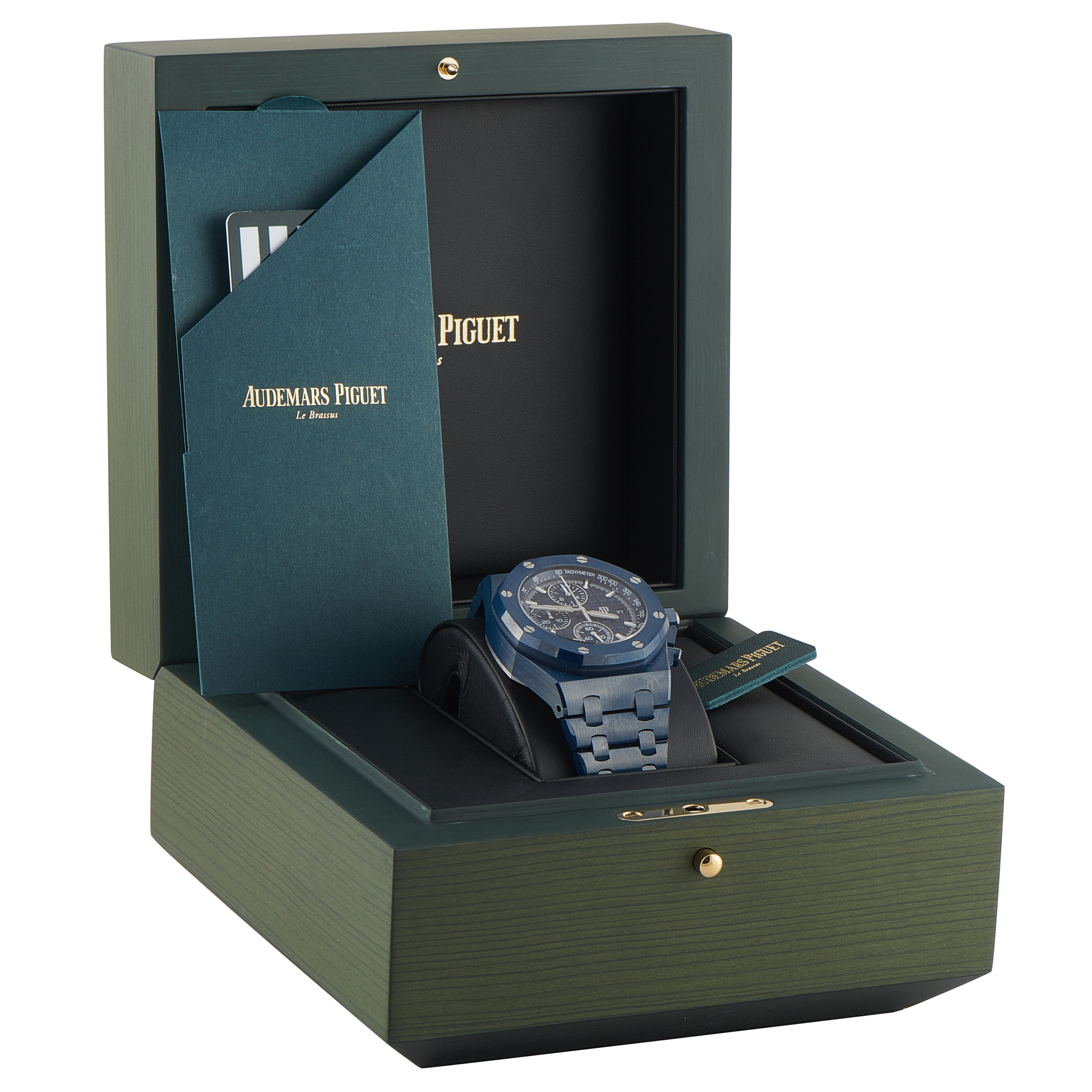This is an unworn Audemars Piguet Royal Oak Offshore Blue Night Ceramic Watch 26238CD.OO.1300CD.01. It comes with the manufacturer’s presentation box and papers.