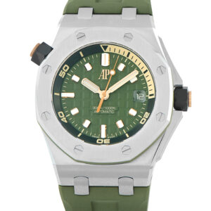 Papers, extra strap, and the manufacturer’s box accompany this unworn Audemars Piguet Royal Oak Offshore Diver Khaki Green Dial Watch 15720ST.OO.A052CA.01.