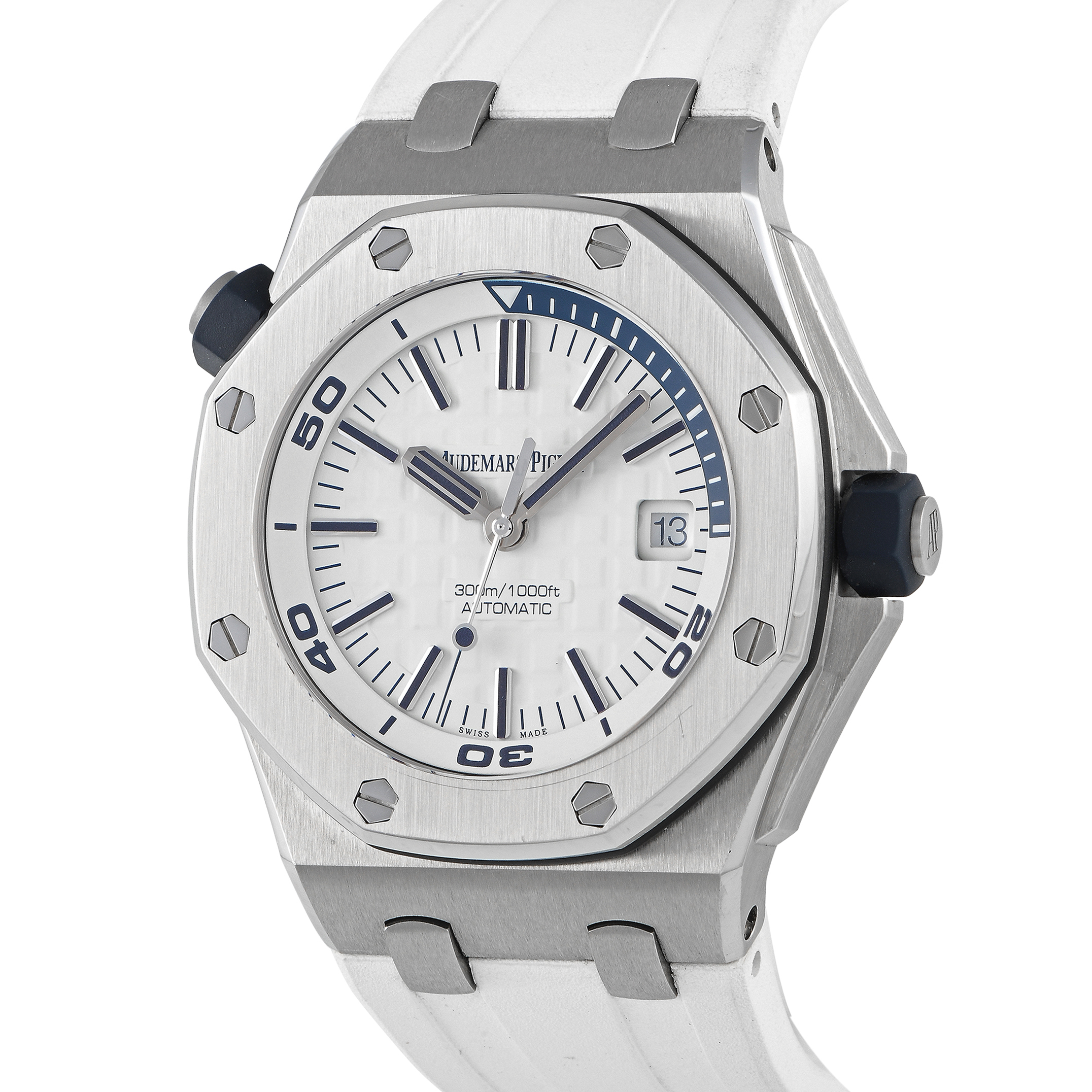 This pre-owned Audemars Piguet Royal Oak Offshore Diver White Dial Watch 15710ST.OO.A010CA.01 comes with papers and the manufacturer’s box.