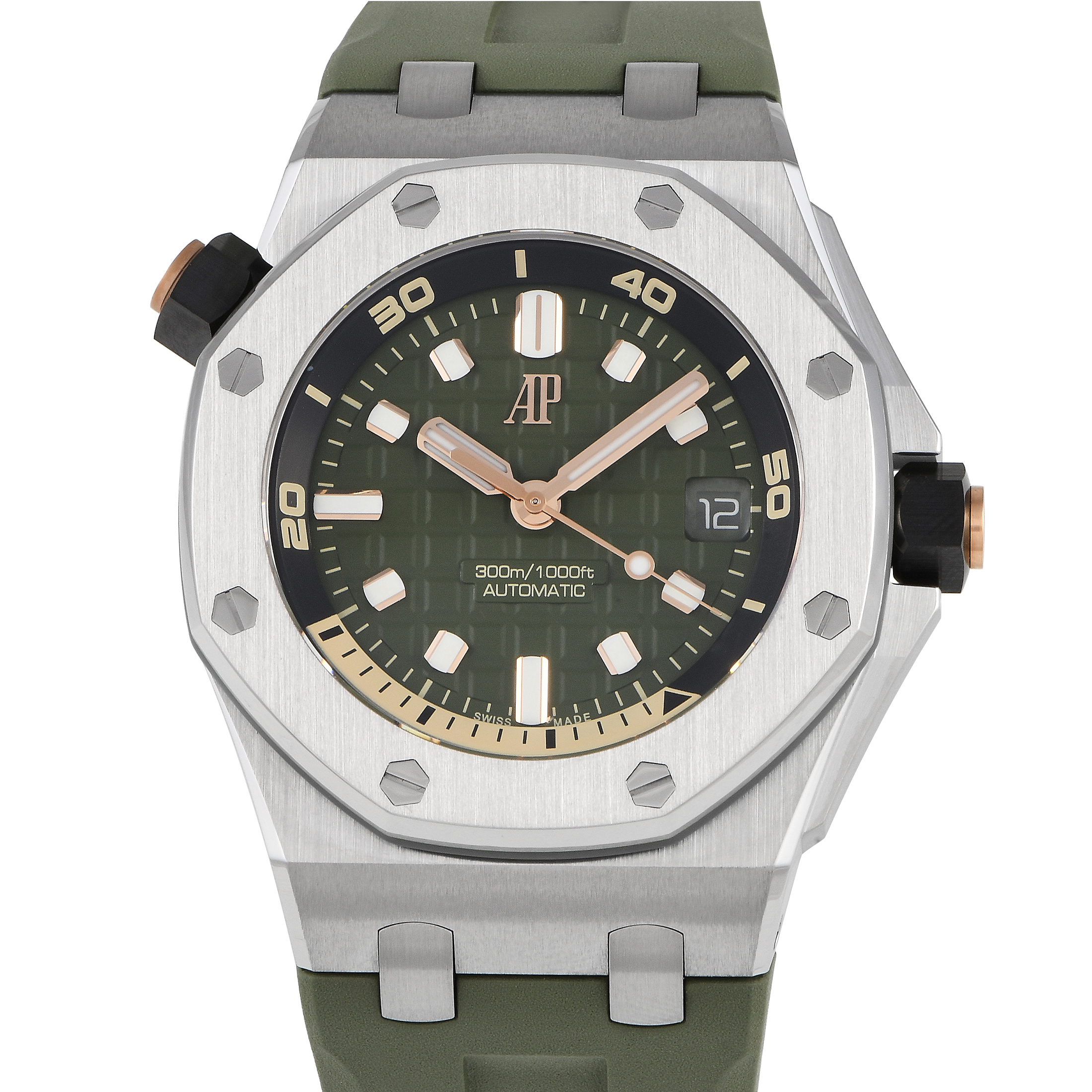 True to Audemars Piguet’s commitment to precision and excellence, this Royal Oak Offshore Diver is spectacularly finished. It has the iconic octagonal bezel mounted on a stout steel case measuring 42mm wide. A khaki green rubber strap matches the khaki green Mega Tapisserie dial with a black and beige rotating inner bezel. The crows are rendered in black ceramic, accented with 18K rose gold caps. Inside the watch is caliber 4308 automatic movement with 32 jewels, time and date functions, and a 60-hour power reserve.