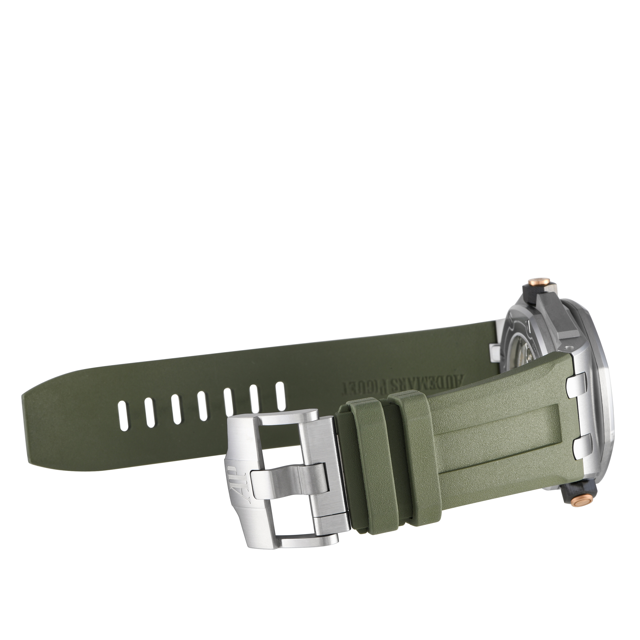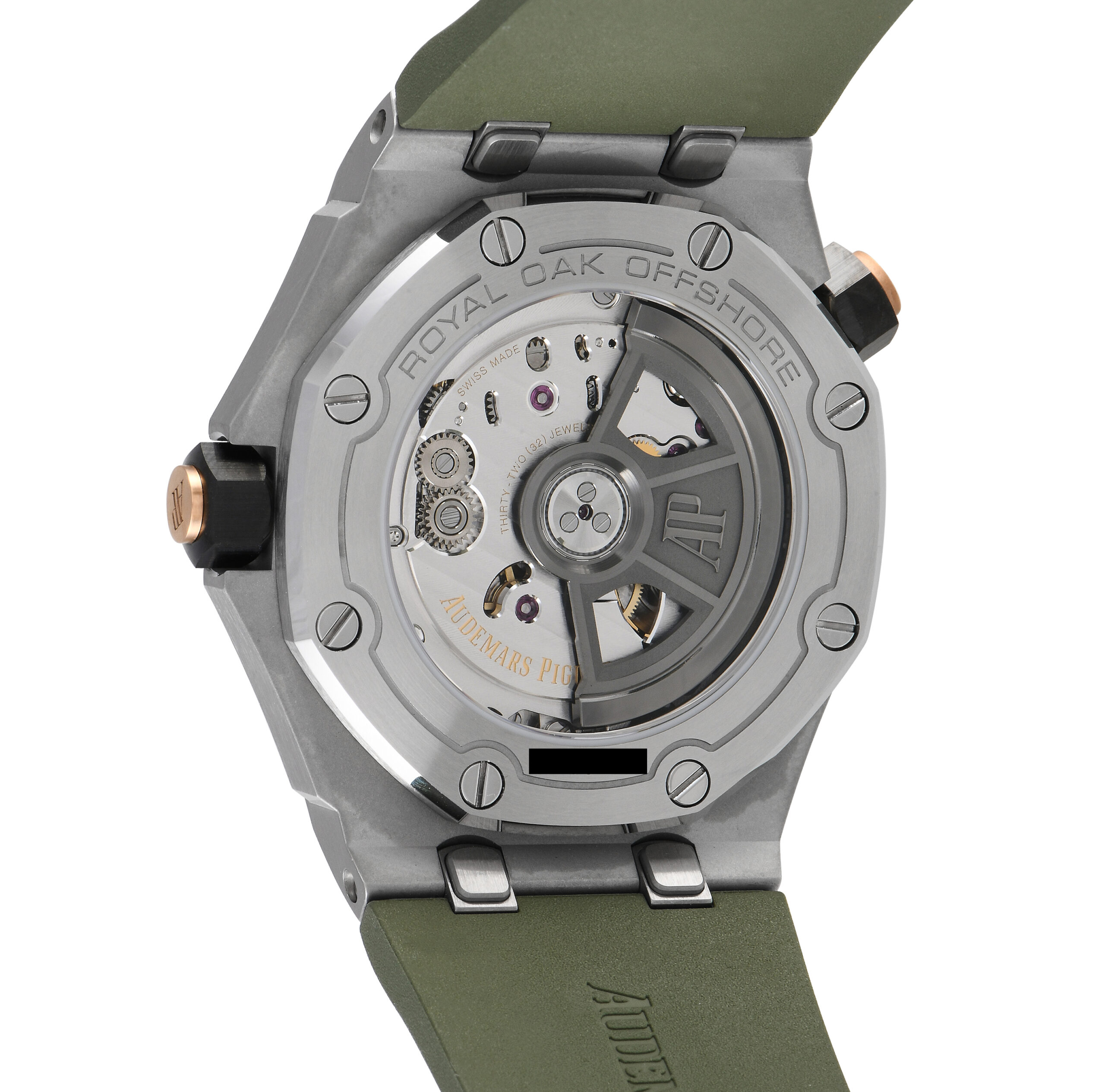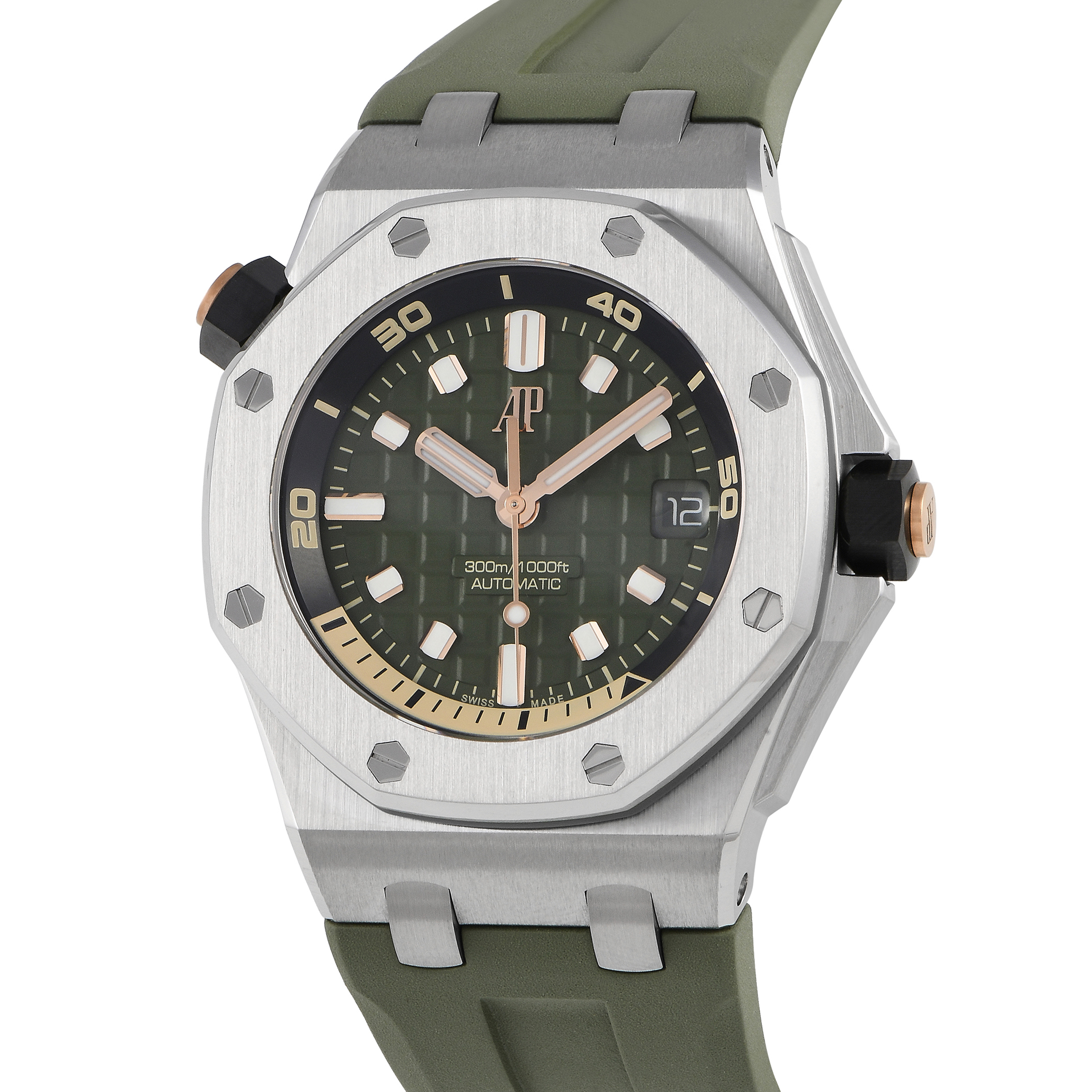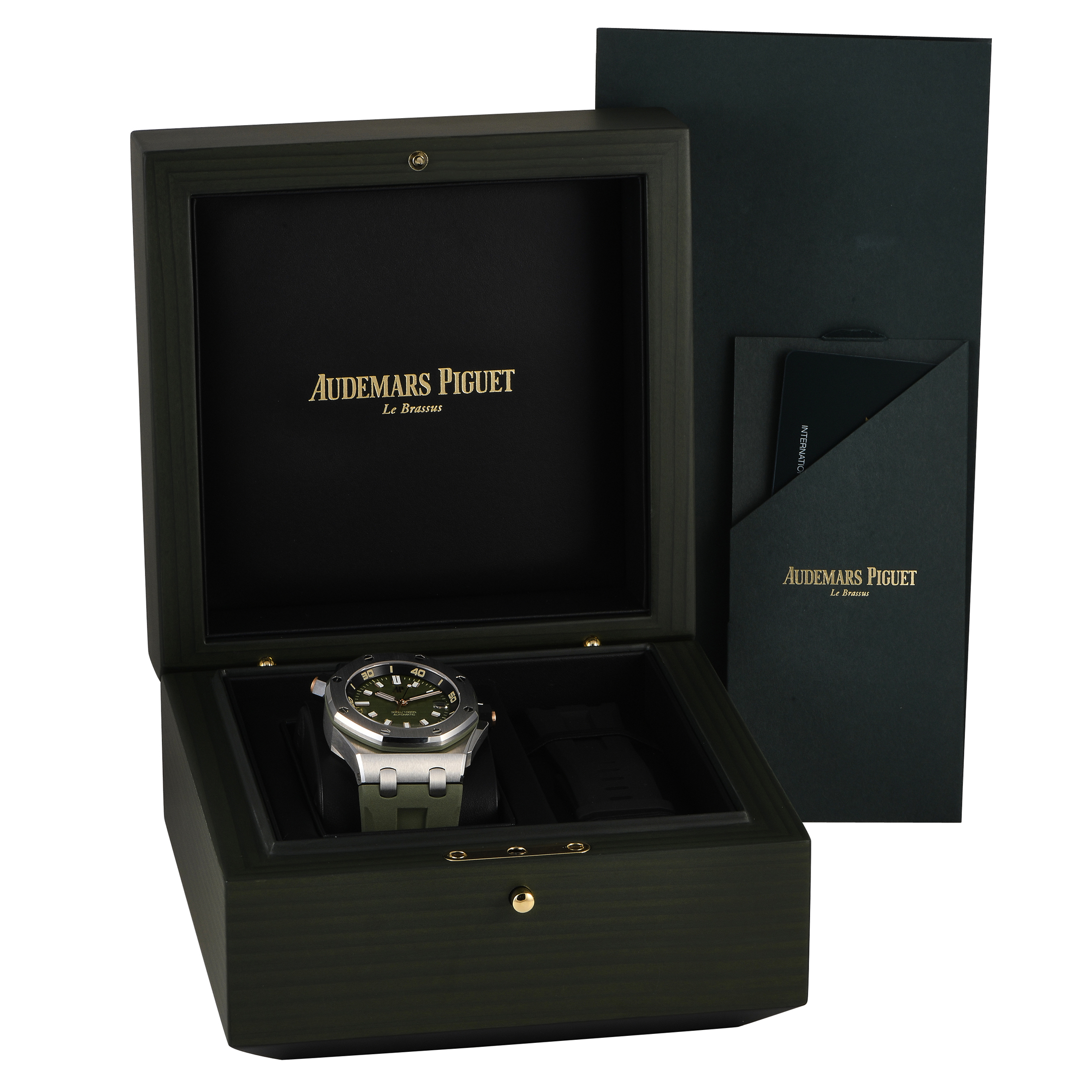 Papers and the manufacturer’s box accompany this pre-owned Audemars Piguet Royal Oak Offshore Diver Khaki Green Watch 15720ST.OO.A052CA.01.
