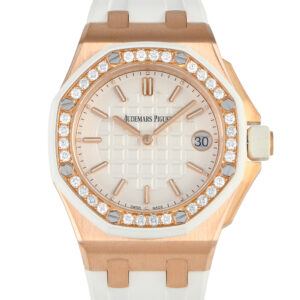 This is a pre-owned Audemars Piguet Royal Oak Offshore Diamond Bezel 18K Rose Gold Quartz Ladies Watch 67540OK.ZZ.A010CA.01. It comes with papers and the manufacturer’s box.