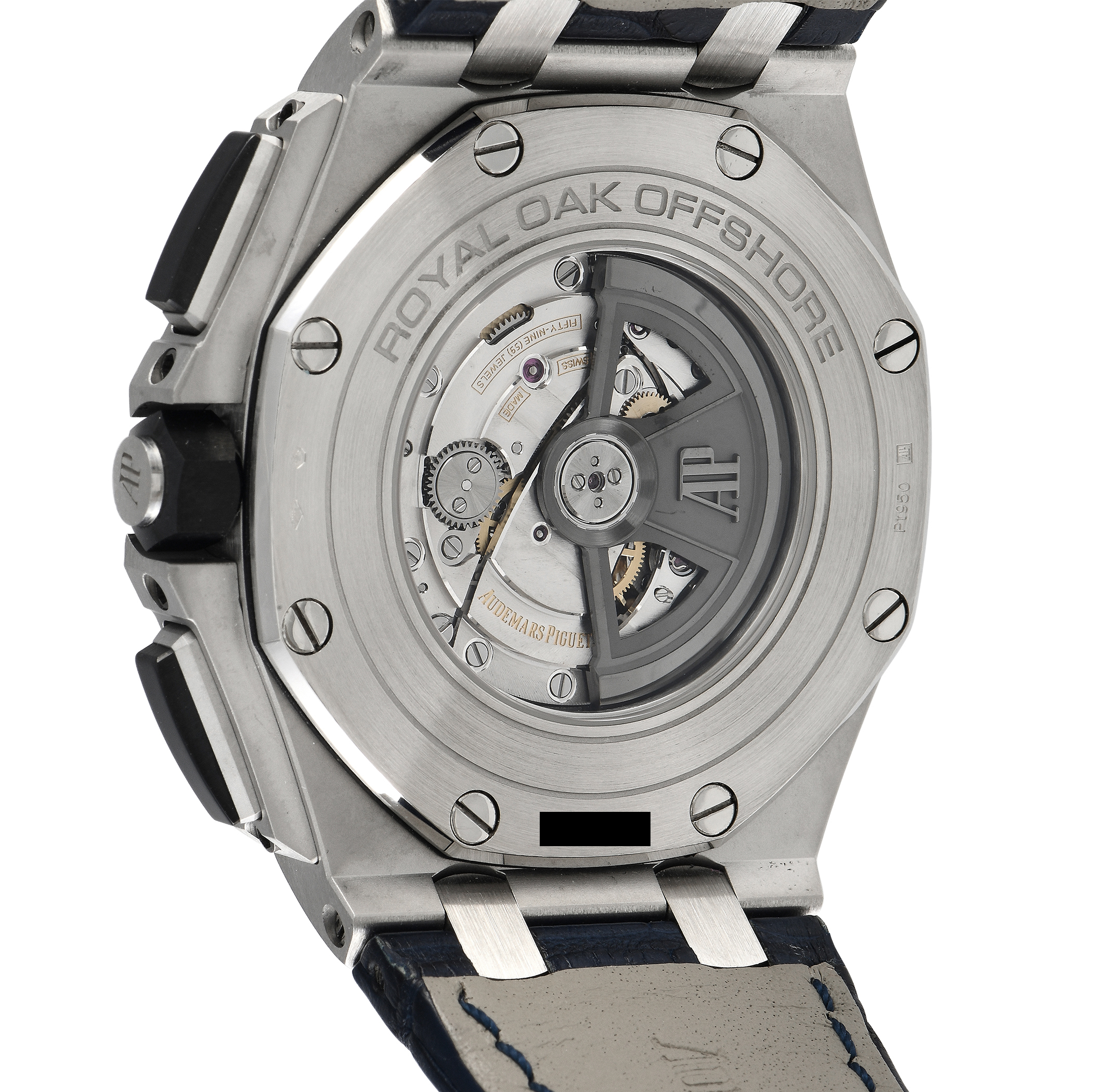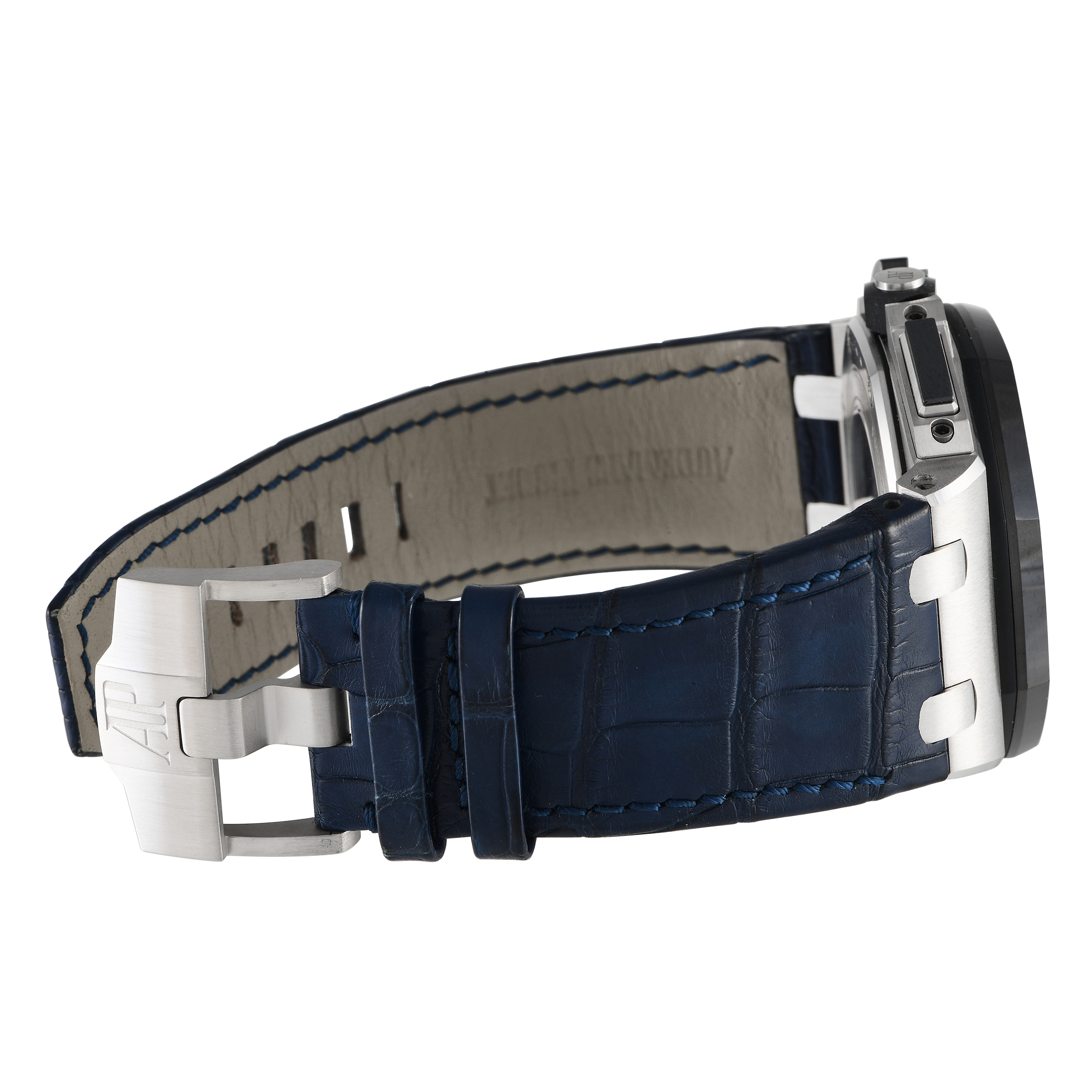 The Audemars Piguet Royal Oak Offshore 44mm Platinum ref. 26401PO.OO.A018CR.01 was released in 2014. It features a blue “Mega Tapisserie” dial with a matching blue alligator leather strap. The robust platinum case has black ceramic pushes and screw-down crown, and a black ceramic bezel. The case is water resistant to 100 meters. On the dial are three silver recessed sub-dials, polished white gold index hour markers and baton hands, a magnified date window at 3, and a raised blue inner tachymeter bezel. Beating inside the watch is the 59-jewel automatic caliber 3126/3840 composed of 365 parts, with 55 hours of power reserve when fully wound.