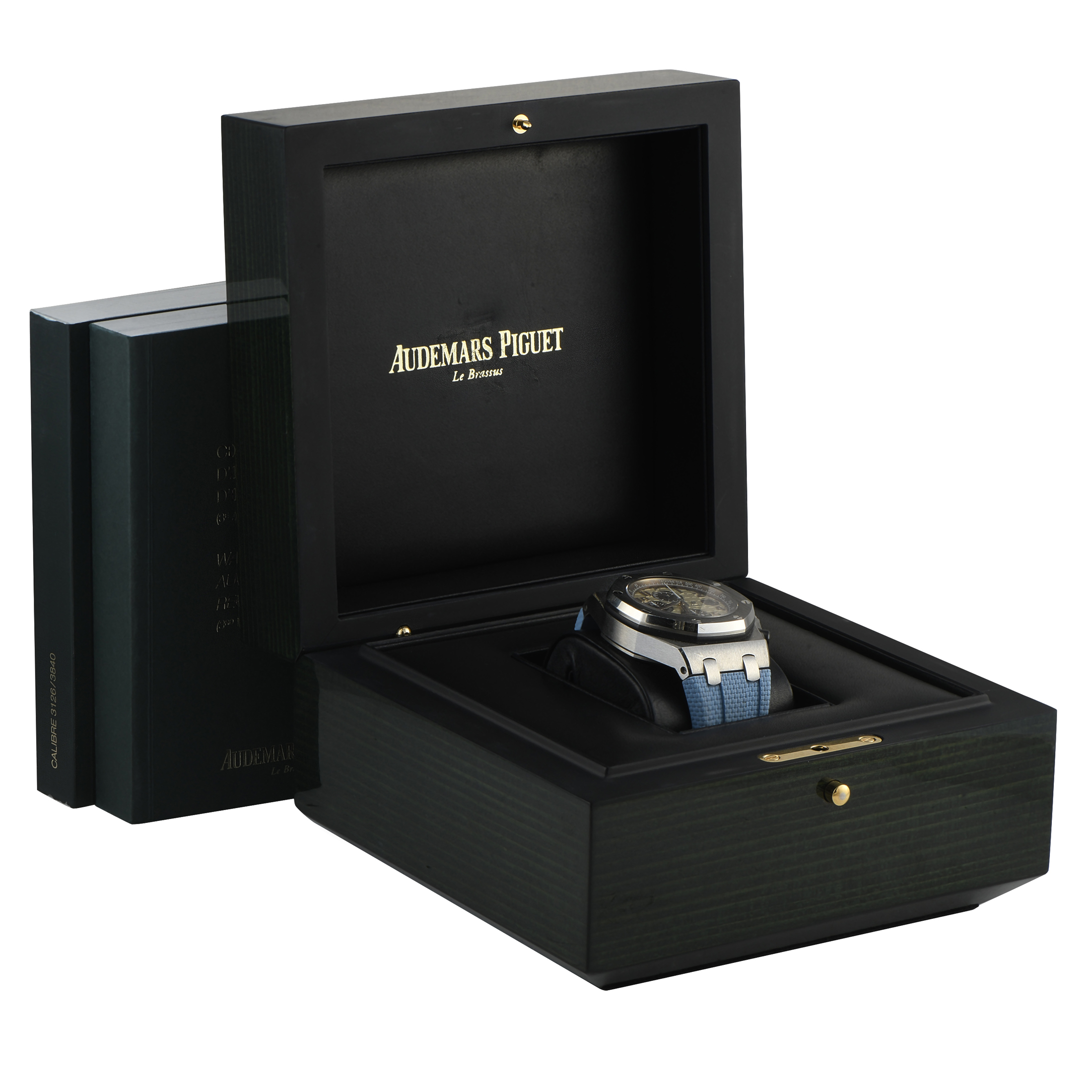 Papers and the manufacturer’s box accompany this pre-owned Audemars Piguet Royal Oak Offshore Watch 26470ST.OO.A801CR.01.