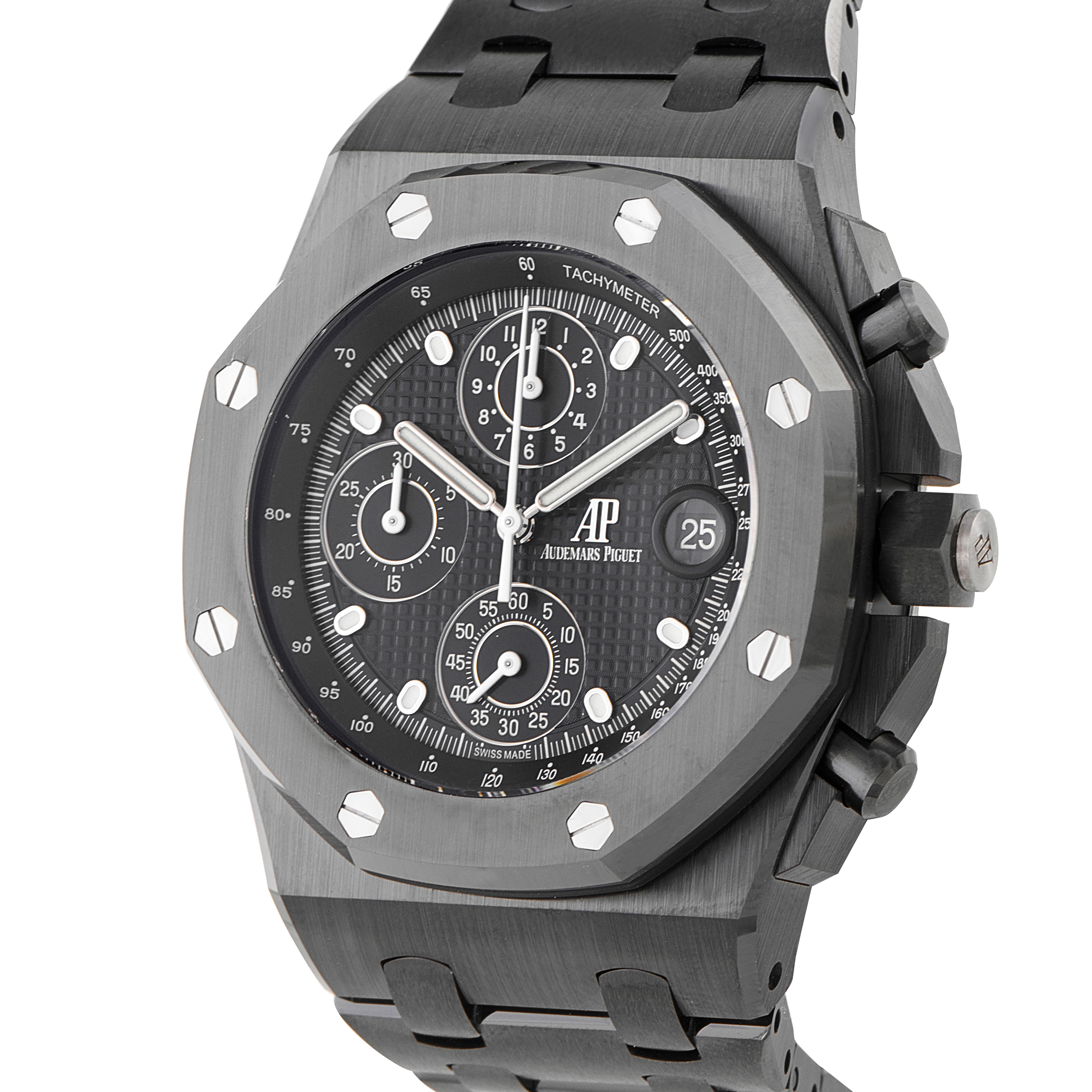 Papers, extra strap, and the manufacturer’s box accompany this pre-owned Audemars Piguet Royal Oak Offshore Smoked Bronze Dial Automatic Watch 26420ST.OO.A828CR.01.