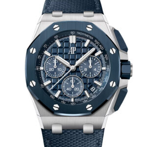 The Audemars Piguet Royal Oak Offshore 26420SO.OO.A029VE.01 blends bold design with technical sophistication. This watch pairs a 43 mm stainless-steel case with a deep-blue “Bleu Nuit, Nuage 50” ceramic bezel, pushers and crown — creating a striking two-tone aesthetic that carries through to the dial.