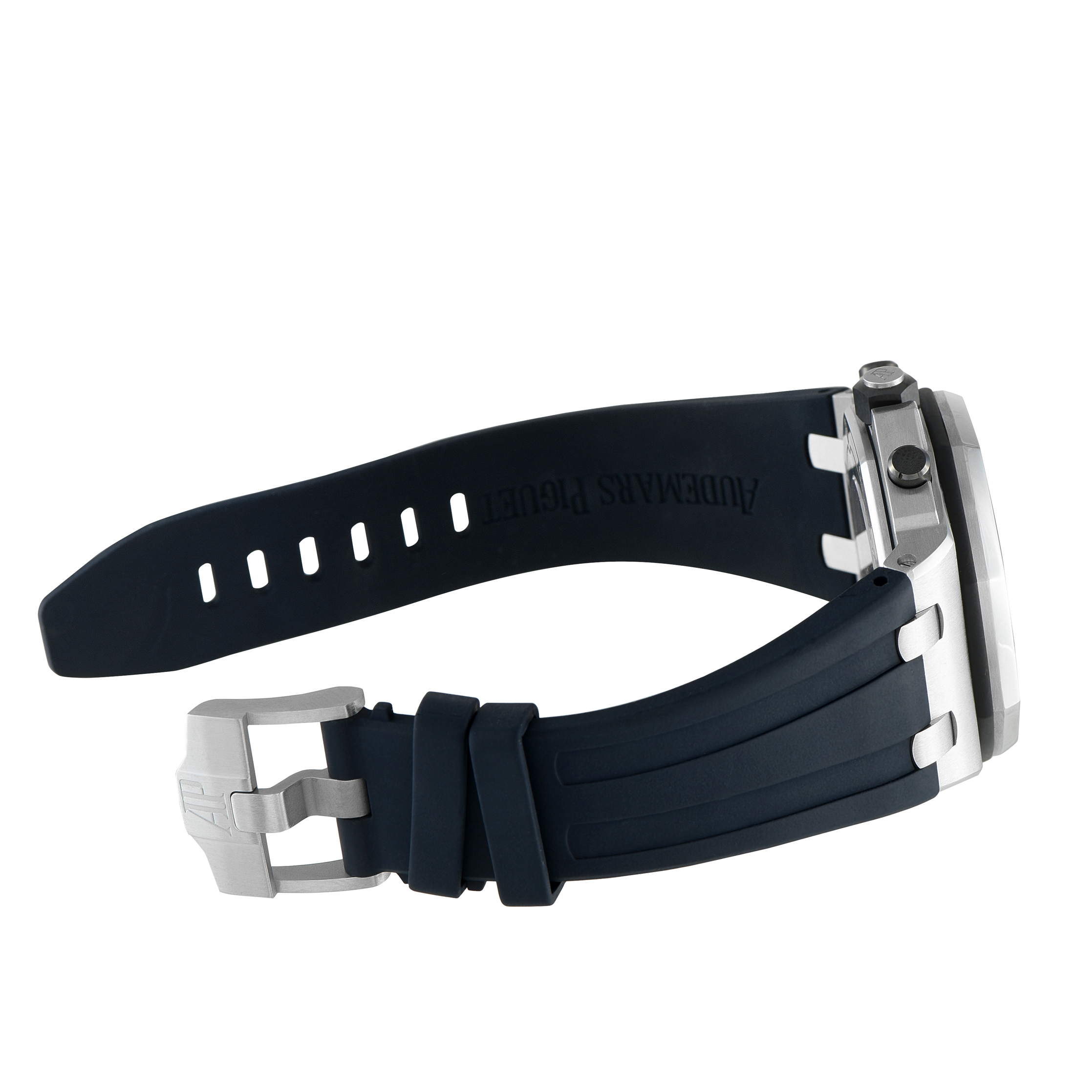 The daring Royal Oak Offshore Chronograph demonstrates boldness not just in its design language but also in its exceptional engineering. It features an oversized case measuring 42mm in diameter, fitted with a brushed octagonal bezel that makes an unmistakable statement. On its blue Mega Tapisserie dial are Arabic numeral hour markers and baton hands, all with luminescent fill. Three registers are positioned at 6-9-12, complemented by a round date window at 3 o’clock. The watch’s beating heart is caliber 3126/3840, beating at 21,600 vph, with a 22-carat gold rotor, 59 jewels, and approximately 50 hours of power reserve.