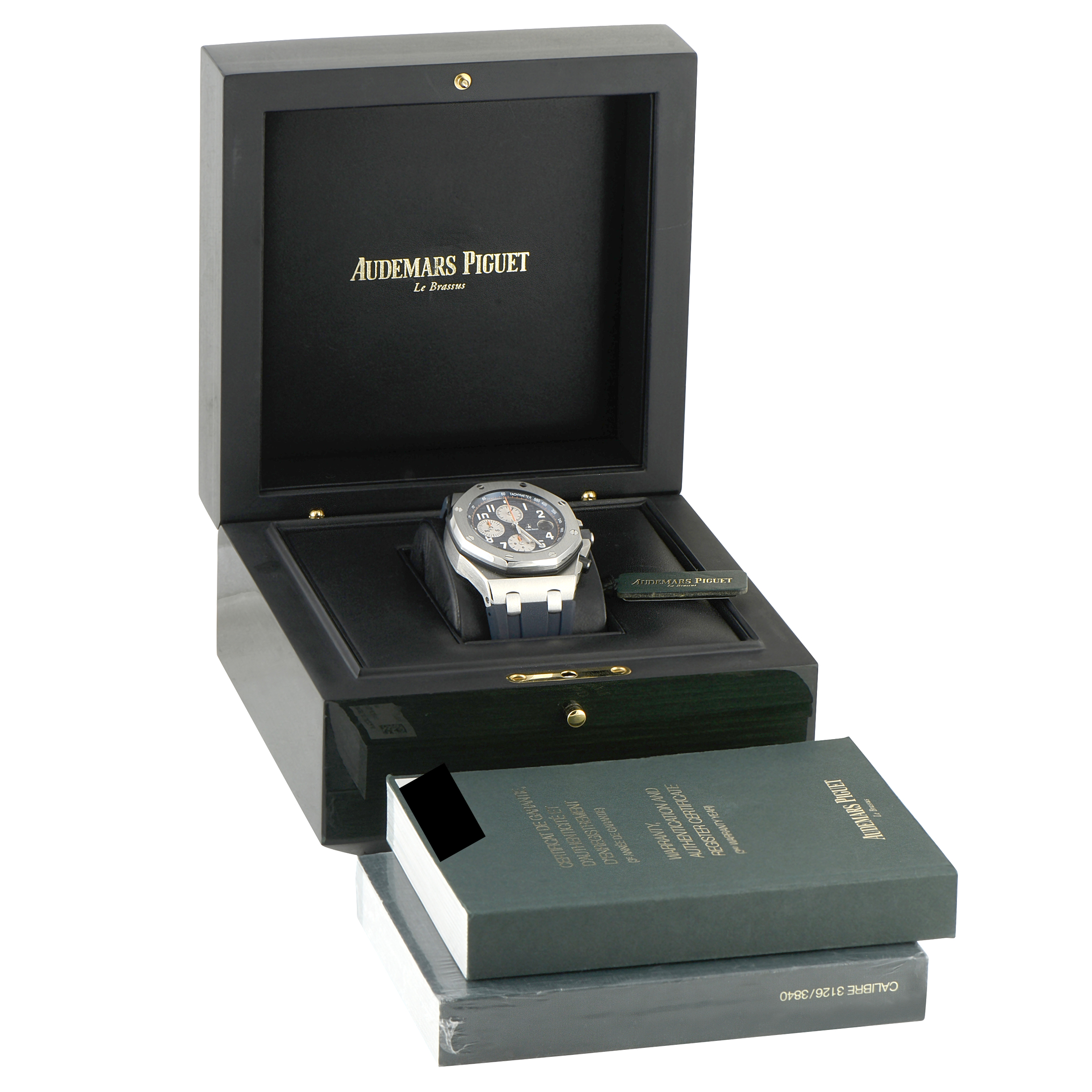 This is a pre-owned Audemars Piguet Royal Oak Offshore Chronograph Watch 26470ST.OO.A027CA.01. It is accompanied by papers and the manufacturer’s box.