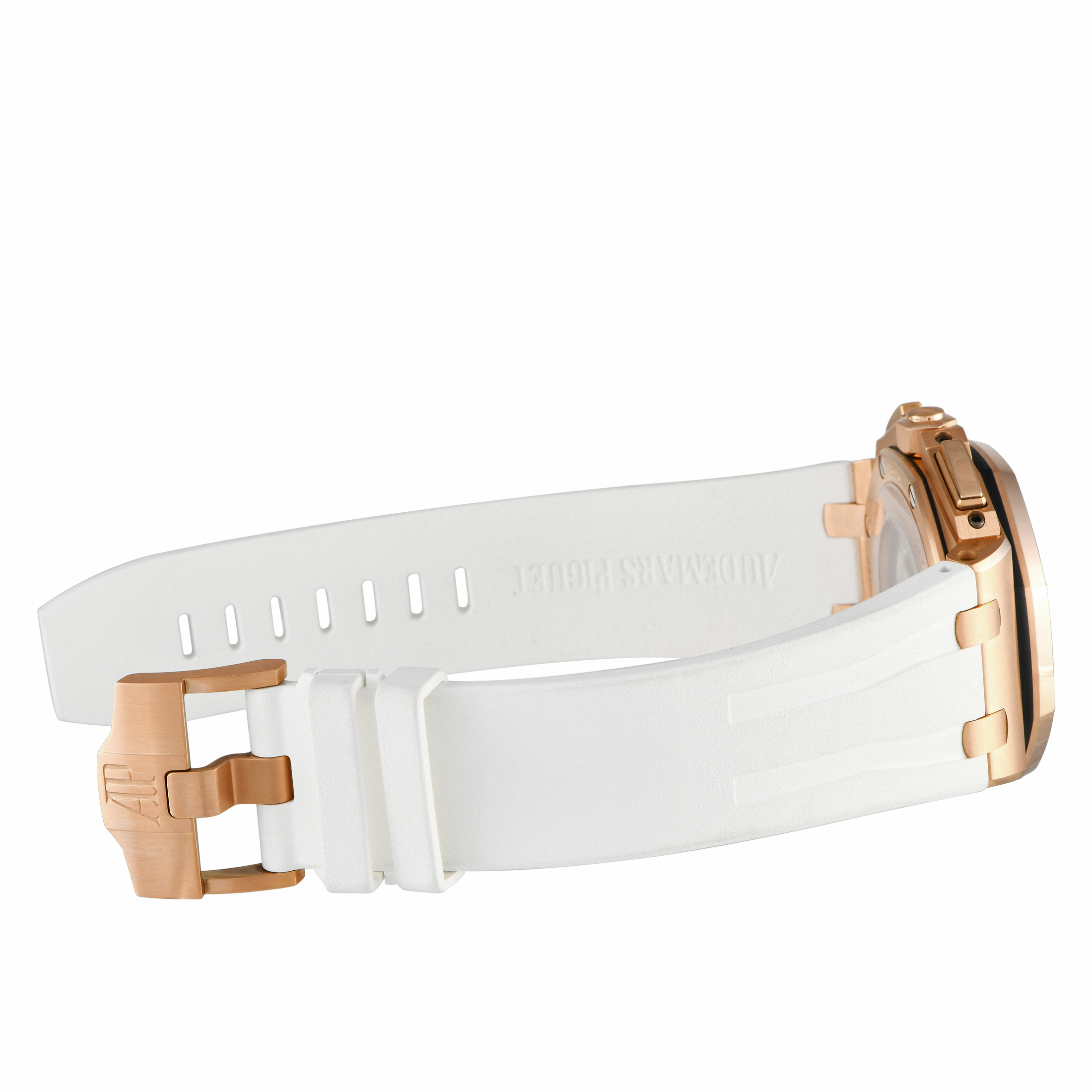 This limited edition Royal Oak Offshore has the perfect summer vibe. This Royal Oak Offshore features a fun and vibrant yet classy combination of white and rose gold. The case measures 44mm wide and is fashioned from 18K rose gold, along with the bezel, lugs, crown, push-pieces, and the bracelet’s tang clasp. A silvery-white Mega Tapisserie dial displays the time via luminous hands and applied rose gold index hour markers. There is a date window at 3 o’clock, plus three chronograph registers. The watch runs on AP caliber 3126/3840 automatic movement with a power reserve of 50 hours when fully wound. A white rubber strap rounds out the southern French allure of the watch.