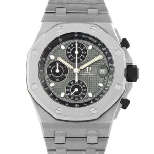 In full titanium and with a modern movement, the Royal Oak Offshore Chronograph ref. 26238TI.00.2000TI.01 is one of the most advanced iterations of the Royal Oak Offshore line. It has a 42mm case housing the in-house Caliber 4404, an automatic movement which drives a flyback chronograph, date display, and 70-hour power reserve. Its gray “Petite Tapisserie” dial features black sub-counters, white-gold hour-markers, and luminescent Royal Oak hands for superior legibility. The watch is paired with a brushed-finished titanium bracelet with quick-change strap system for versatile wear.