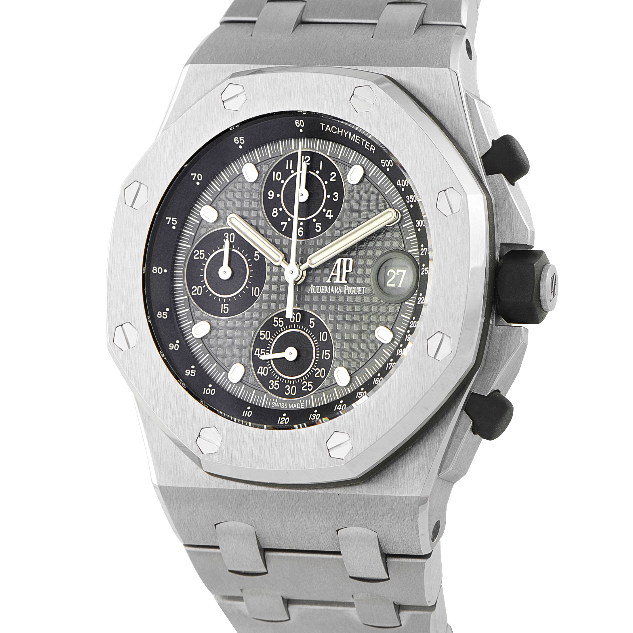 In full titanium and with a modern movement, the Royal Oak Offshore Chronograph ref. 26238TI.00.2000TI.01 is one of the most advanced iterations of the Royal Oak Offshore line. It has a 42mm case housing the in-house Caliber 4404, an automatic movement which drives a flyback chronograph, date display, and 70-hour power reserve. Its gray “Petite Tapisserie” dial features black sub-counters, white-gold hour-markers, and luminescent Royal Oak hands for superior legibility. The watch is paired with a brushed-finished titanium bracelet with quick-change strap system for versatile wear.