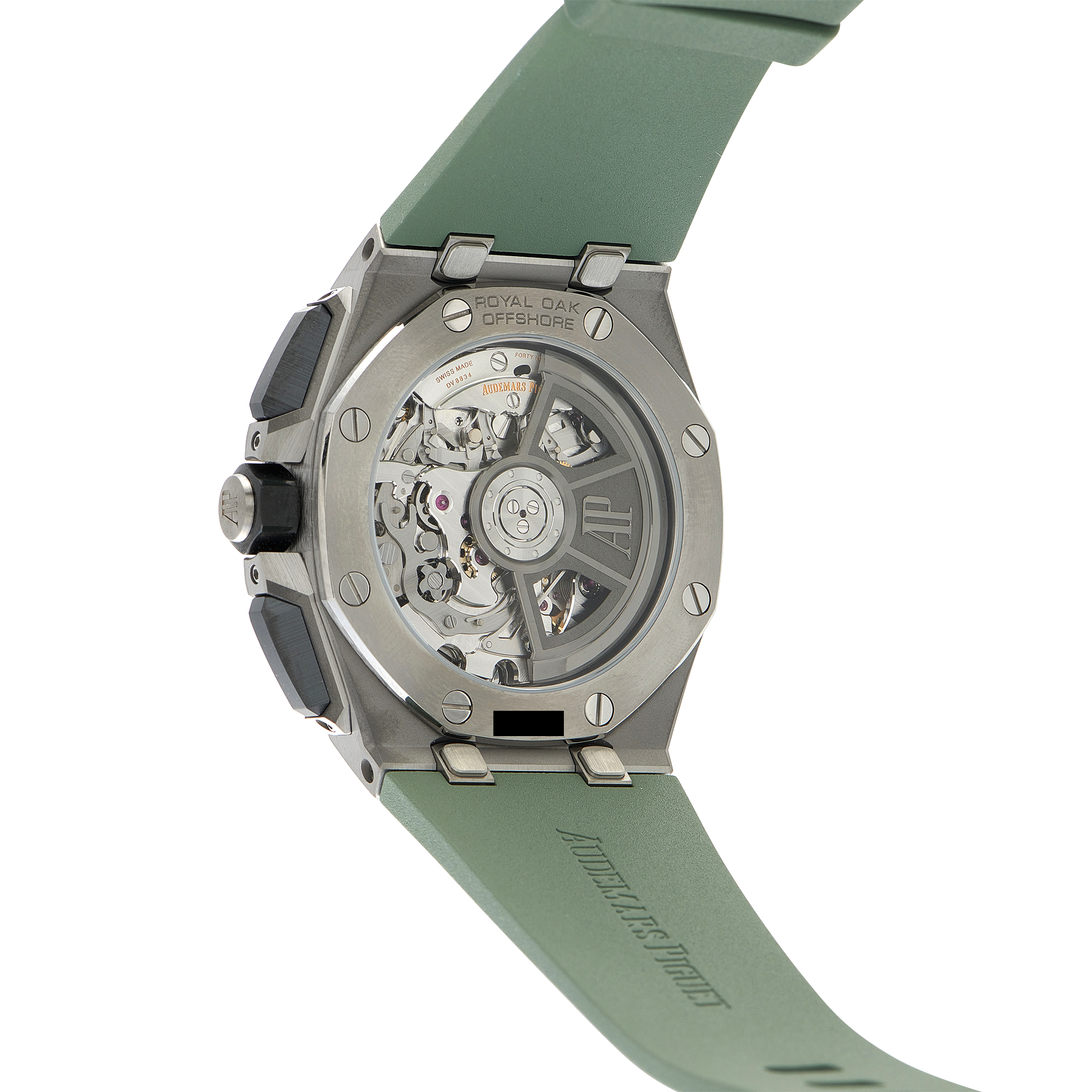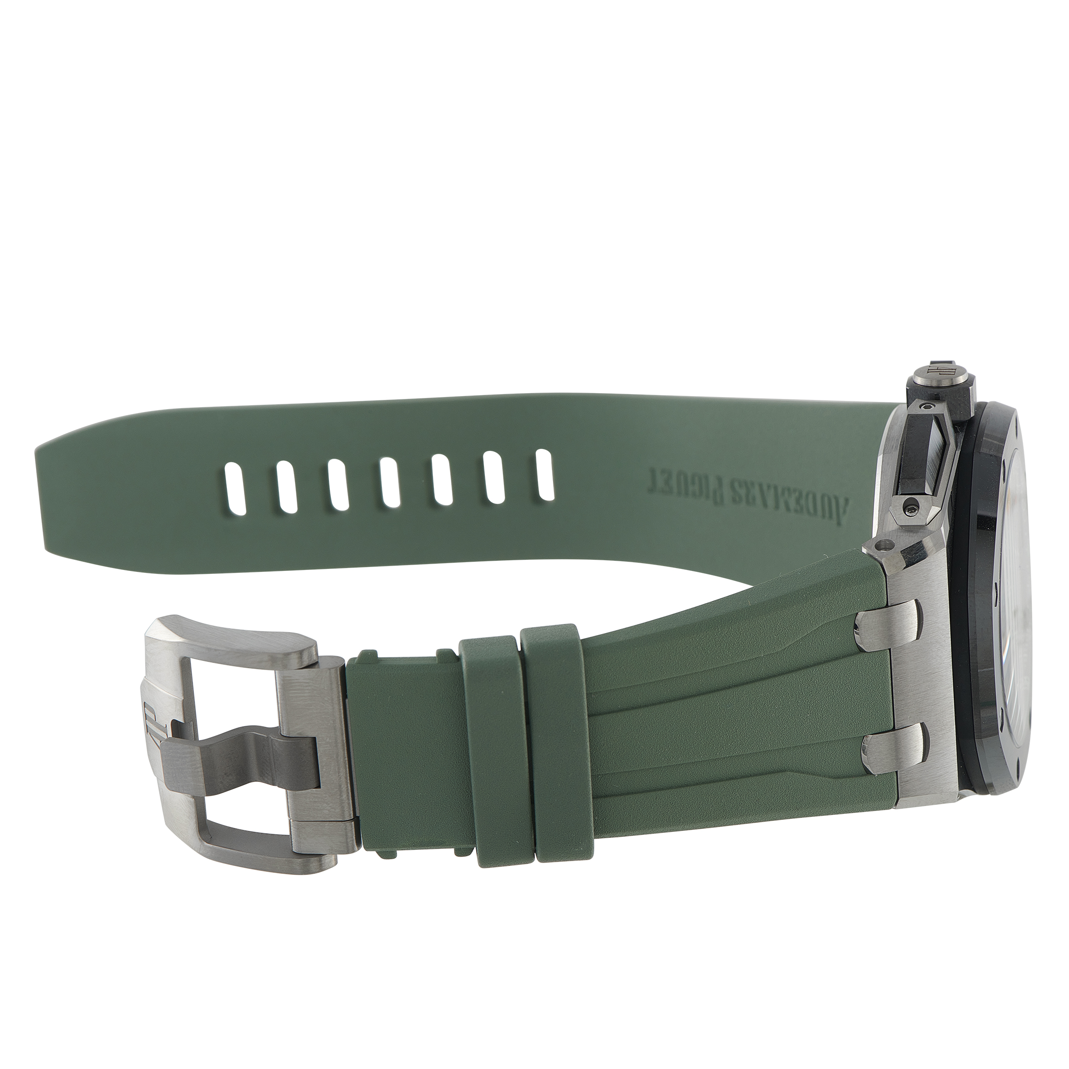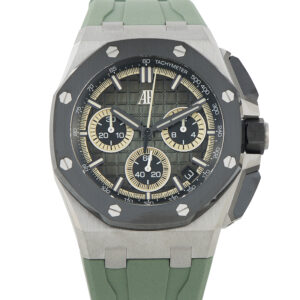 The Audemars Piguet Royal Oak Offshore Chronograph Titanium Watch, reference number 2642010.00.402CA.01, features a striking combination of earthy colors that provide this piece with a tactical aesthetic.