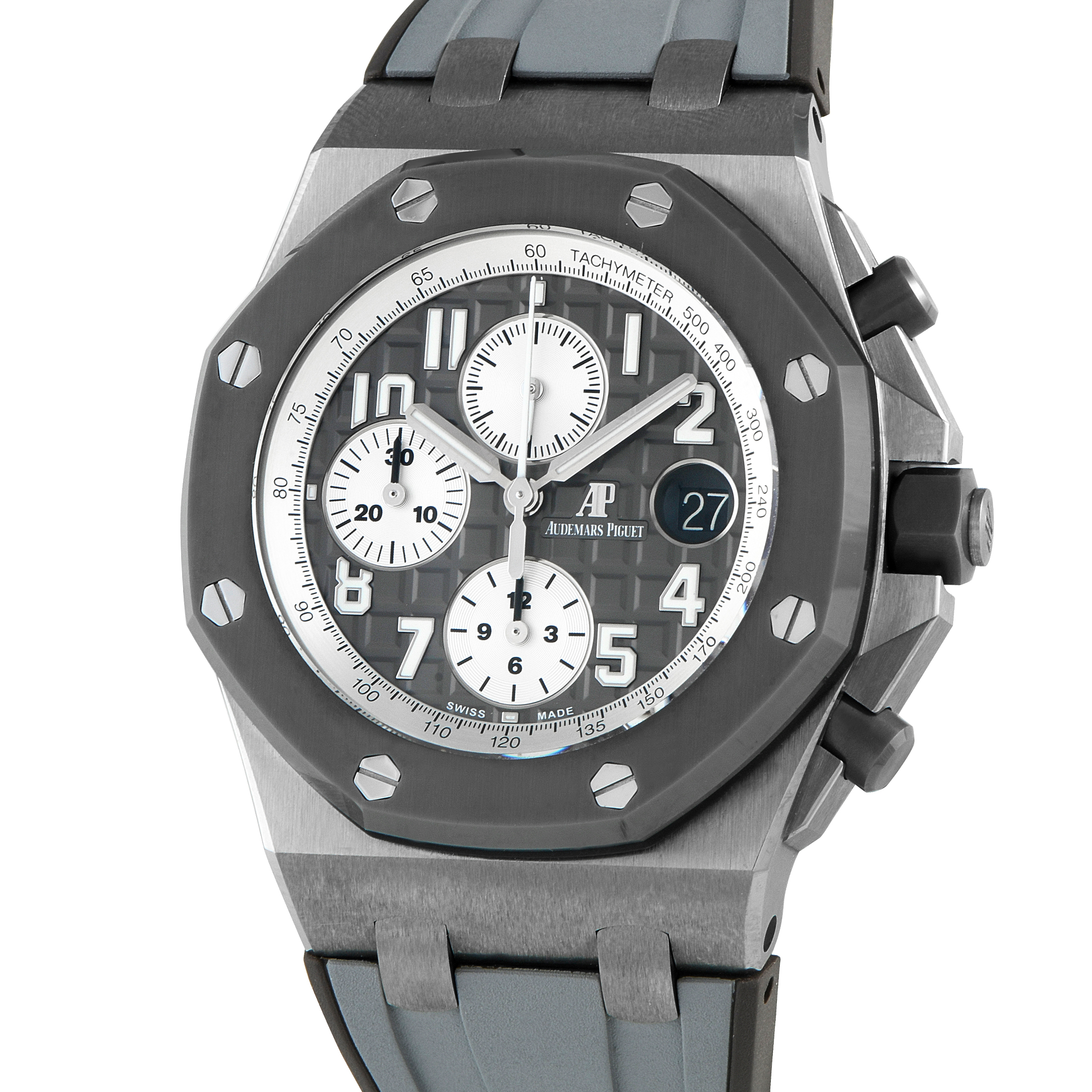 This is a pre-owned Audemars Piguet Royal Oak Offshore Chronograph Gray Ceramic and Titanium Watch 26470IO.OOA006CA.01.A. It comes with papers and the manufacturer’s box.
