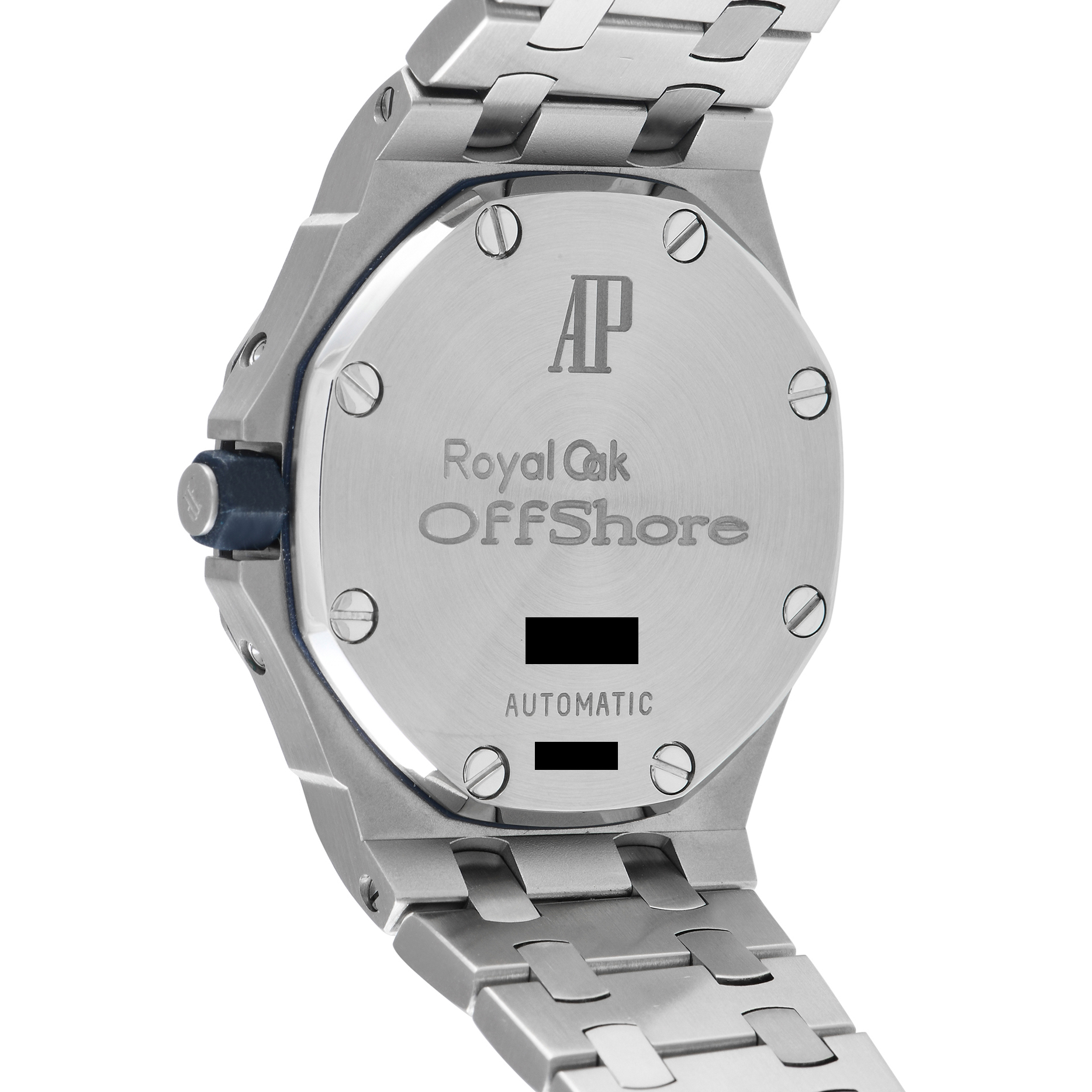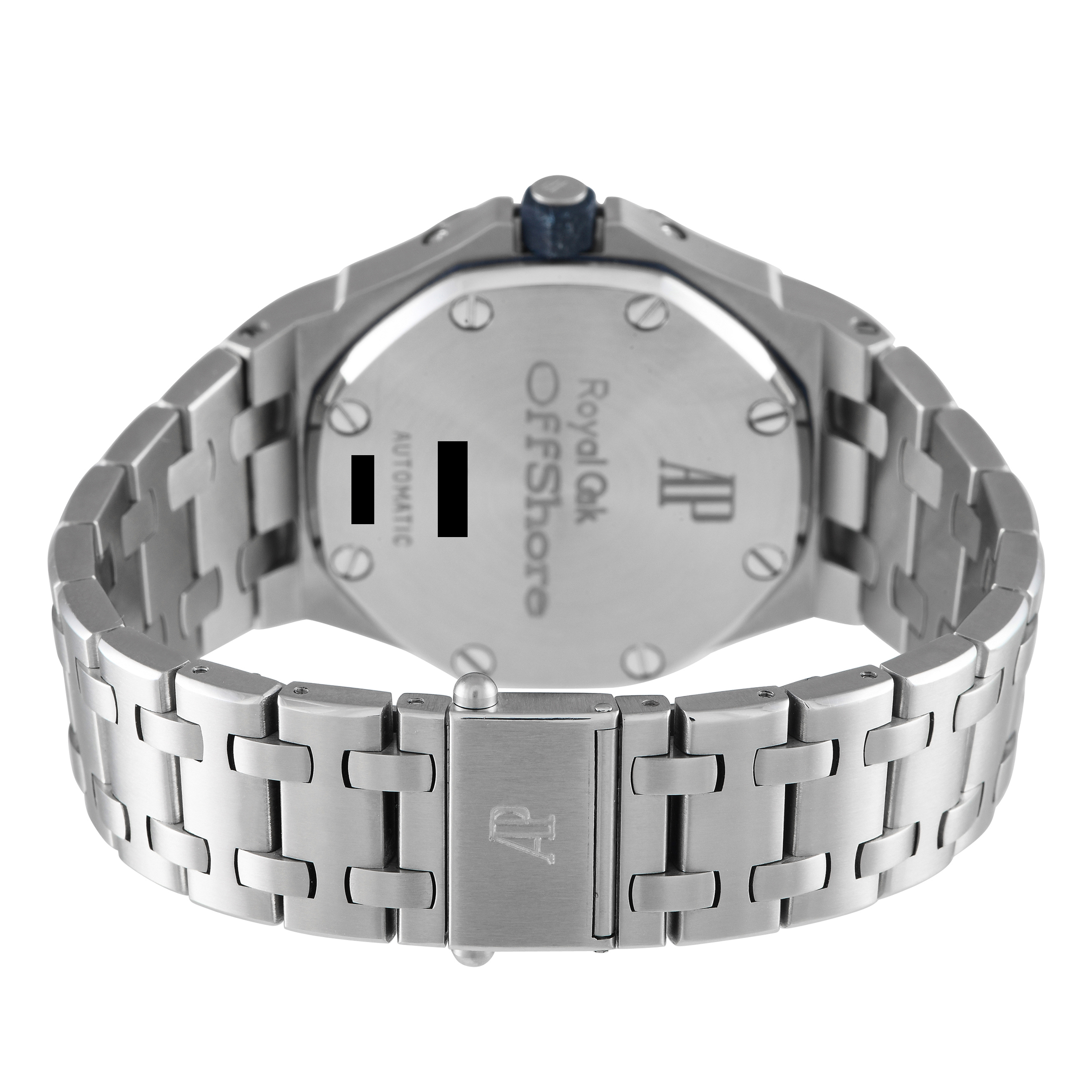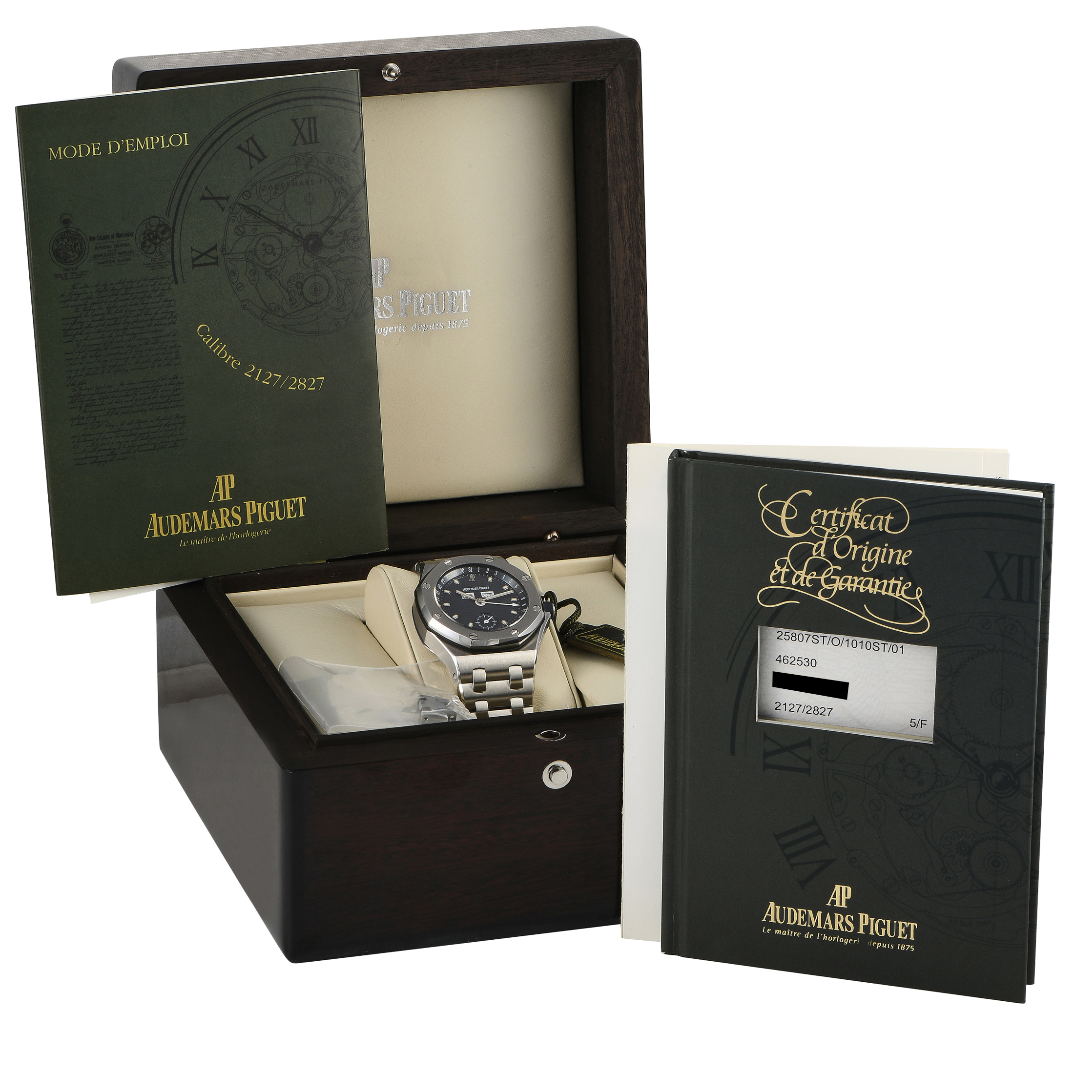 Papers and the manufacturer’s box accompany this pre-owned Audemars Piguet Royal Oak Offshore Triple Calendar Men’s Watch 25807ST.OO.1010ST.01.