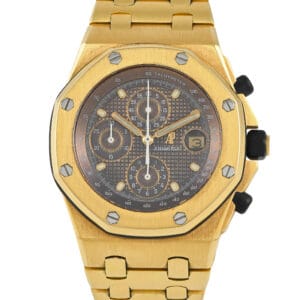 A yellow gold beast and a true grail, this Royal Oak Offshore ref.25721BA is a fascinating watch clad entirely in solid 18K yellow gold. The watch showcases the same dial configuration as the first Royal Oak Offshore introduced in 1993 but with a slightly larger ‘clous de Paris’ petite tapisserie pattern. The tropical dial bears yellow gold indices and hands with luminescent fill and three registers with yellow gold rims. The magnified date window that sits at 3:00 has the date wheel in gold and the numerals in black. Concealed by the solid caseback is the AP caliber 2326/2840 containing 50 jewels, with approximately 40 hours of power reserve, and is water resistant up to 100 meters.