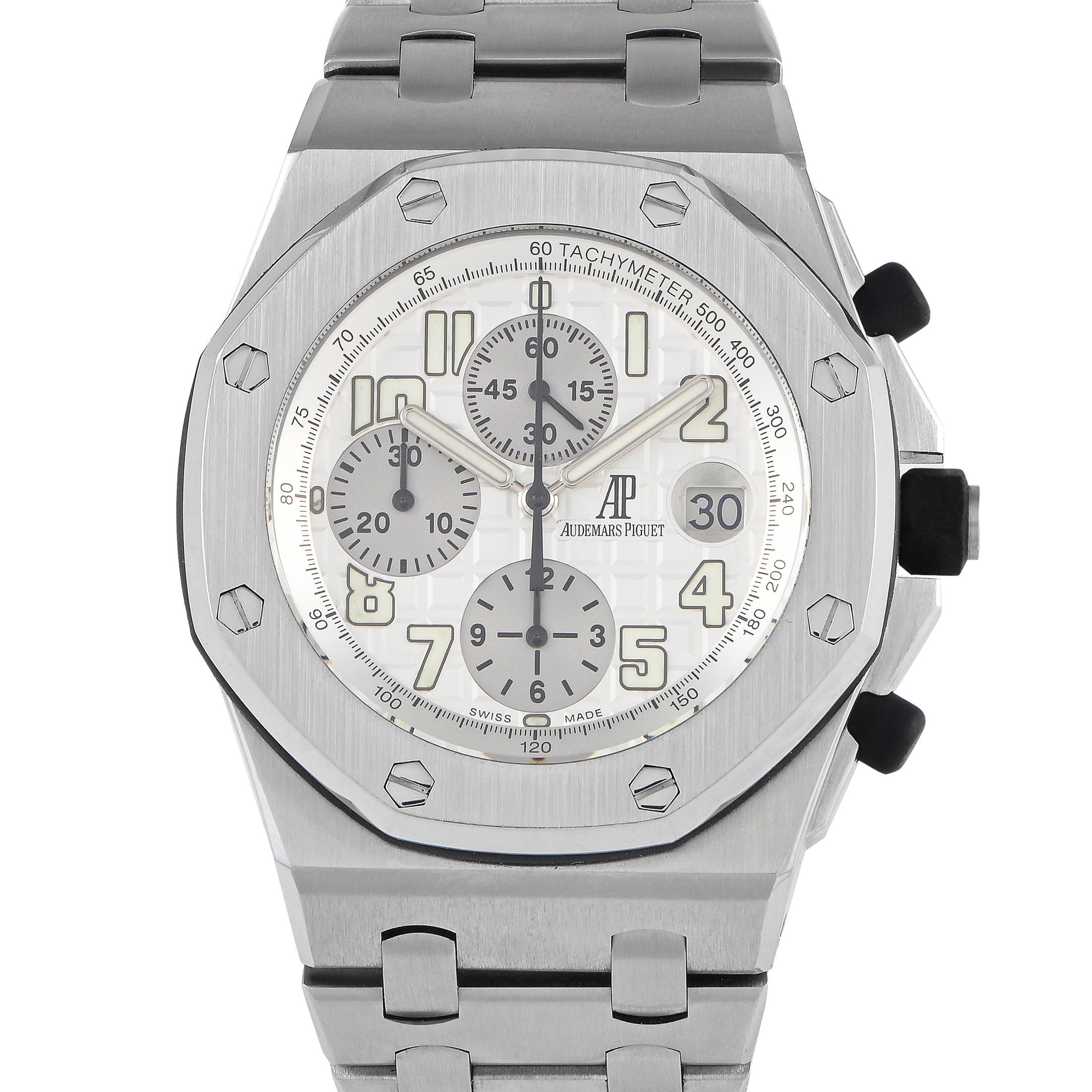 This pre-owned Audemars Piguet Royal Oak Offshore Silver Dial Watch 25721ST.OO.1000ST.07 is accompanied by papers and the manufacturer’s box.