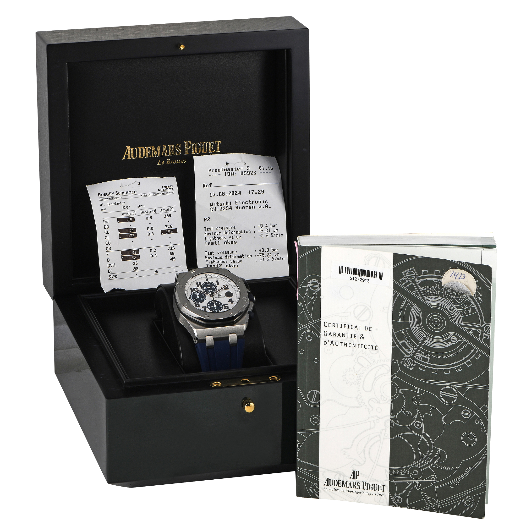 Papers and the manufacturer’s box accompany this pre-owned Audemars Piguet Royal Oak Offshore Chronograph Navy Blue Watch 26170ST.OO.D305CR.01.