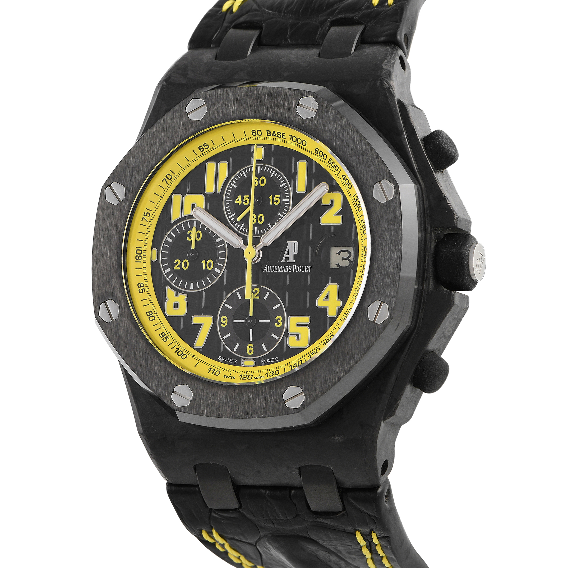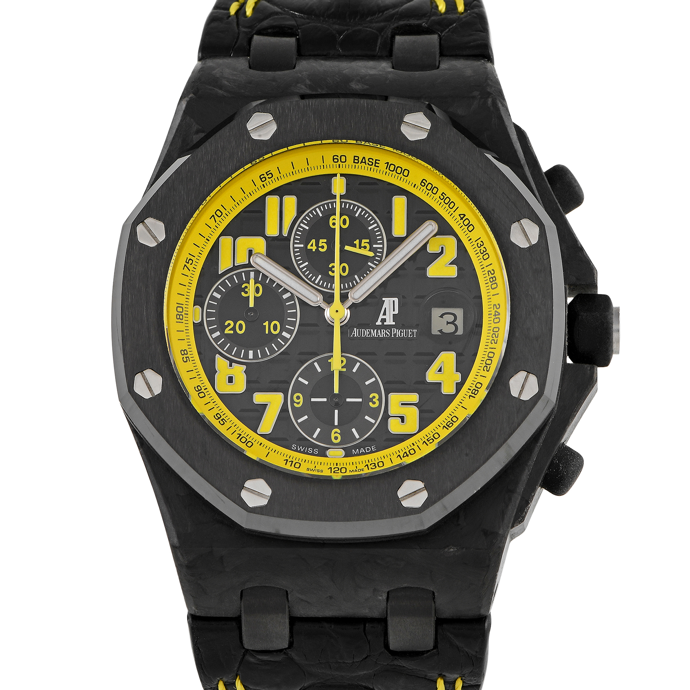 Best known as the Bumble Bee, the lightweight yet hardwearing Royal Oak Offshore Chronograph ref. 26176FO.OO.D101CR.02 sports a striking black and yellow color motif. Its 42mm case is rendered in black forged carbon and fitted with an incredibly resilient black ceramic bezel. The black dial has a yellow outer flange matching the yellow Arabic numeral hour markers. Three chrono sub-dials are also present, along with a 3 o’clock date window. Inside the case is the in-house caliber 3126/3840 automatic movement with approximately 60 hours of power reserve.