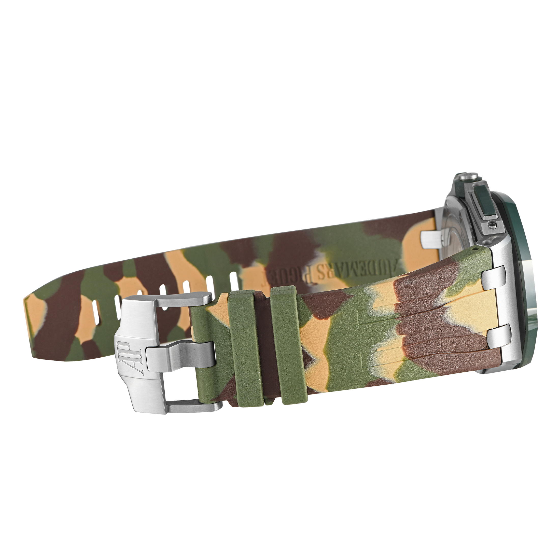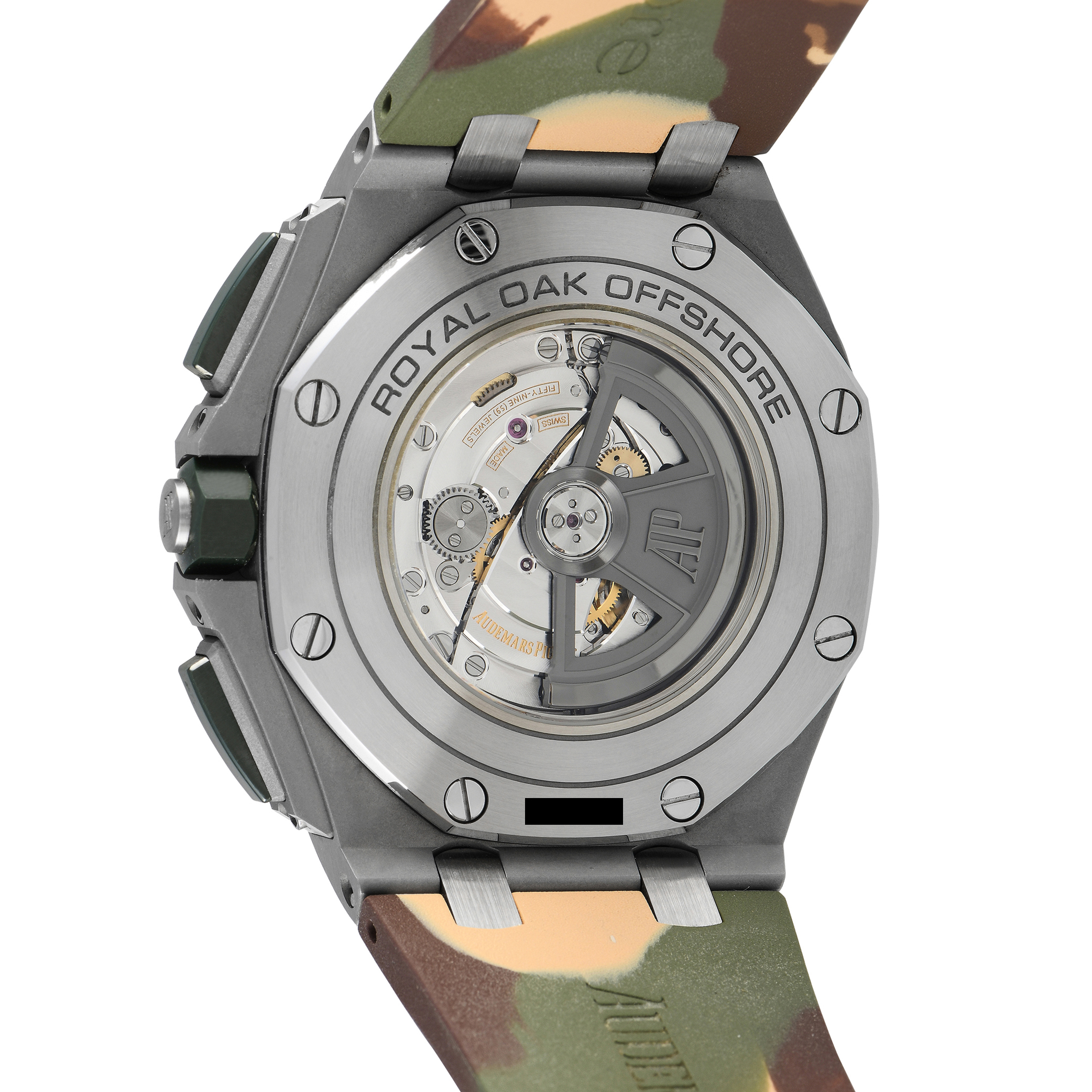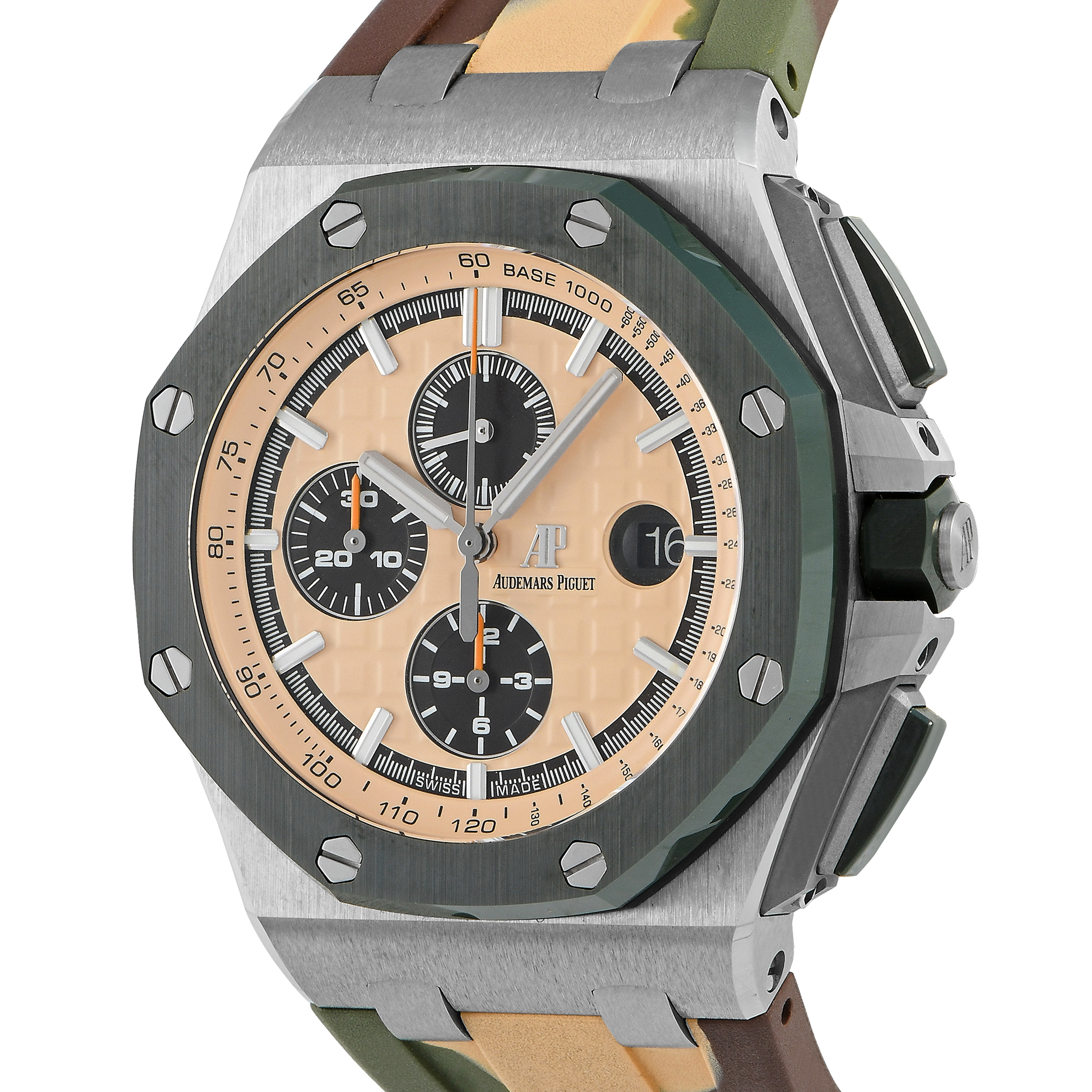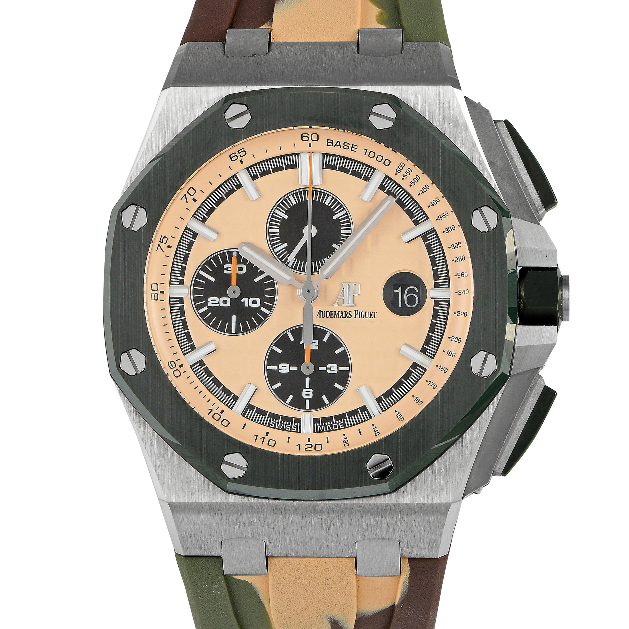 The discontinued Royal Oak Offshore Chronograph ref. 26400SO.OO.A054CA.01 presents a look ready for combat. It features a 44mm steel case with a green ceramic bezel and matching ceramic pushers and crown. The rubber strap has a camouflage pattern and a tang clasp. On the watch’s beige dial are luminous index hour markers and hands, a date window at 3 o’clock, and chronograph registers at 6, 9, and 12. Beneath it beats caliber 3126/3840 automatic movement composed of 59 jewels, 365 parts, and provides a power reserve of 50 hours.
