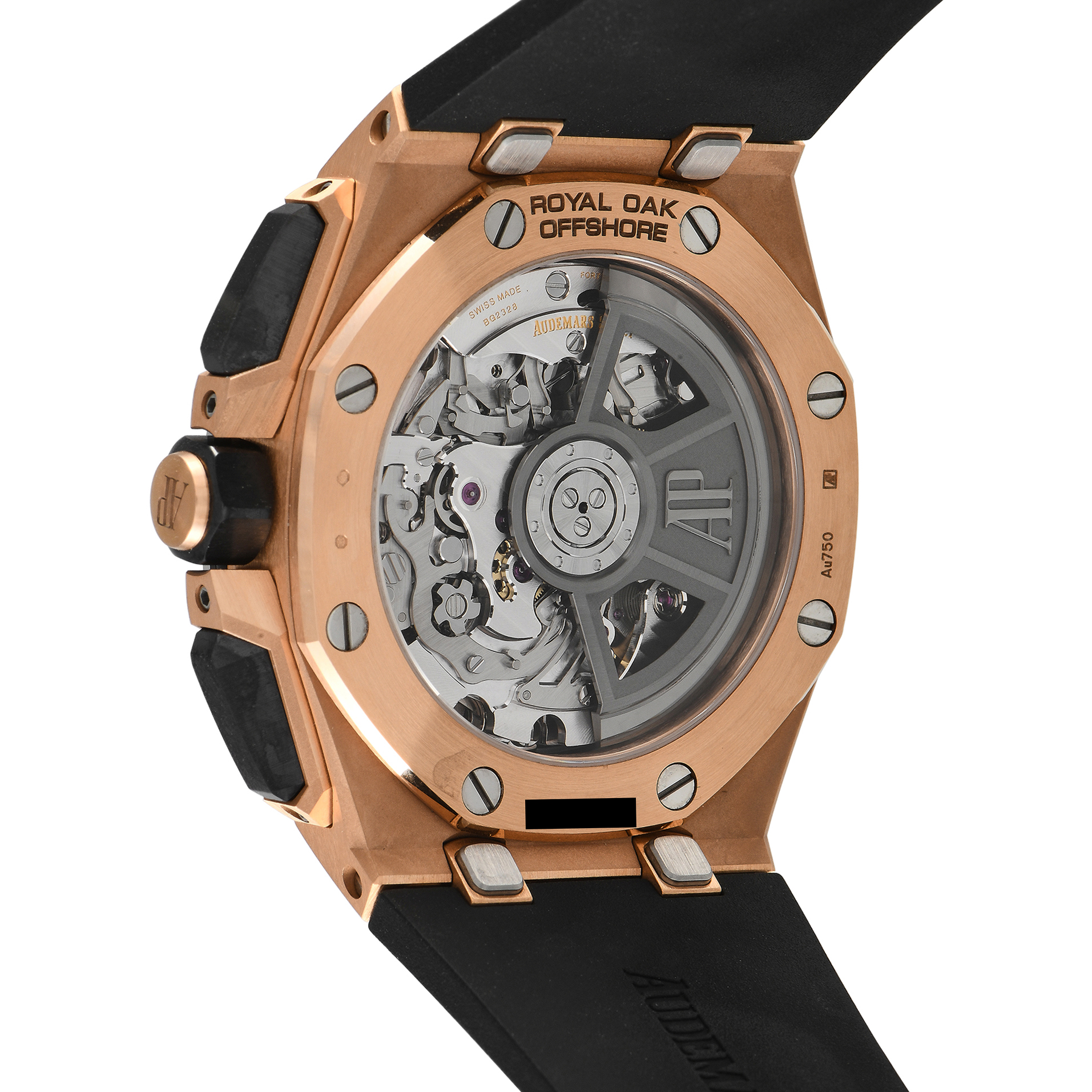This Audemars Piguet Royal Oak Offshore Chronograph 18K Rose Gold Watch 26420RO.OO.A002CA.01 is offered in pre-owned condition. It is accompanied by papers and the manufacturer’s box.