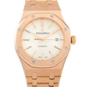 In this modern Royal Oak ref.15400OR.OO.1220OR.02, Audemars Piguet blends the warm hue of rose gold with expert craftsmanship and high-precision horology. Its 41mm x 9.80mm is forged in 18K rose gold and fitted with a sapphire crystal on the front and back. The silver dial bears a Grande Tapisserie pattern, with applied rose gold hour markers and rose gold hands—all with luminescent coating. The discreet date window sits at the 3 o’clock position. The watch is driven by caliber 3120 automatic movement composed of 280 parts, with approximately 60 hours of power reserve.