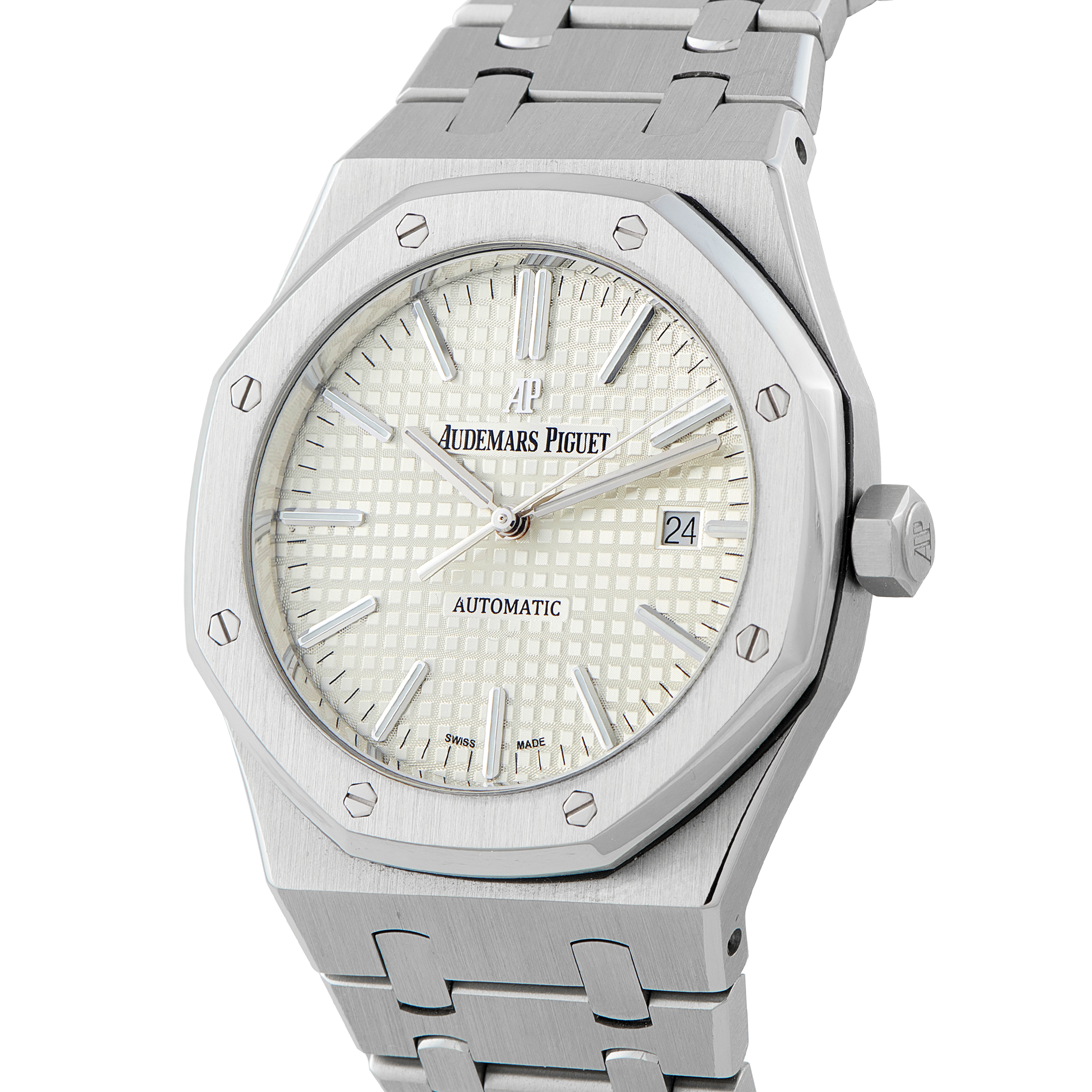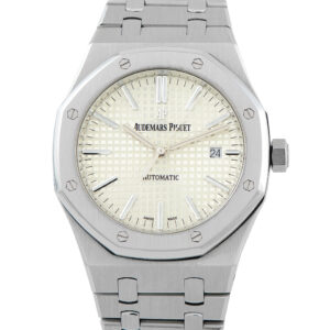 Few steel watches carry this level of recognition. Rendered in steel with a silver “Grande Tapisserie” dial, the Audemars Piguet Royal Oak ref. 15400ST maintains a fully monochromatic presence that adapts easily across settings, from tailored to casual. The 41mm case has the signature brushed octagonal bezel with polished bevels, paired with an integrated bracelet that articulates smoothly through a series of tapering links. Inside, Caliber 3120 provides reliable automatic performance and a 60-hour reserve. The watch’s durability, finishing, comfort, and balanced design explain its sustained demand among collectors seeking a steel Royal Oak that does everything well.