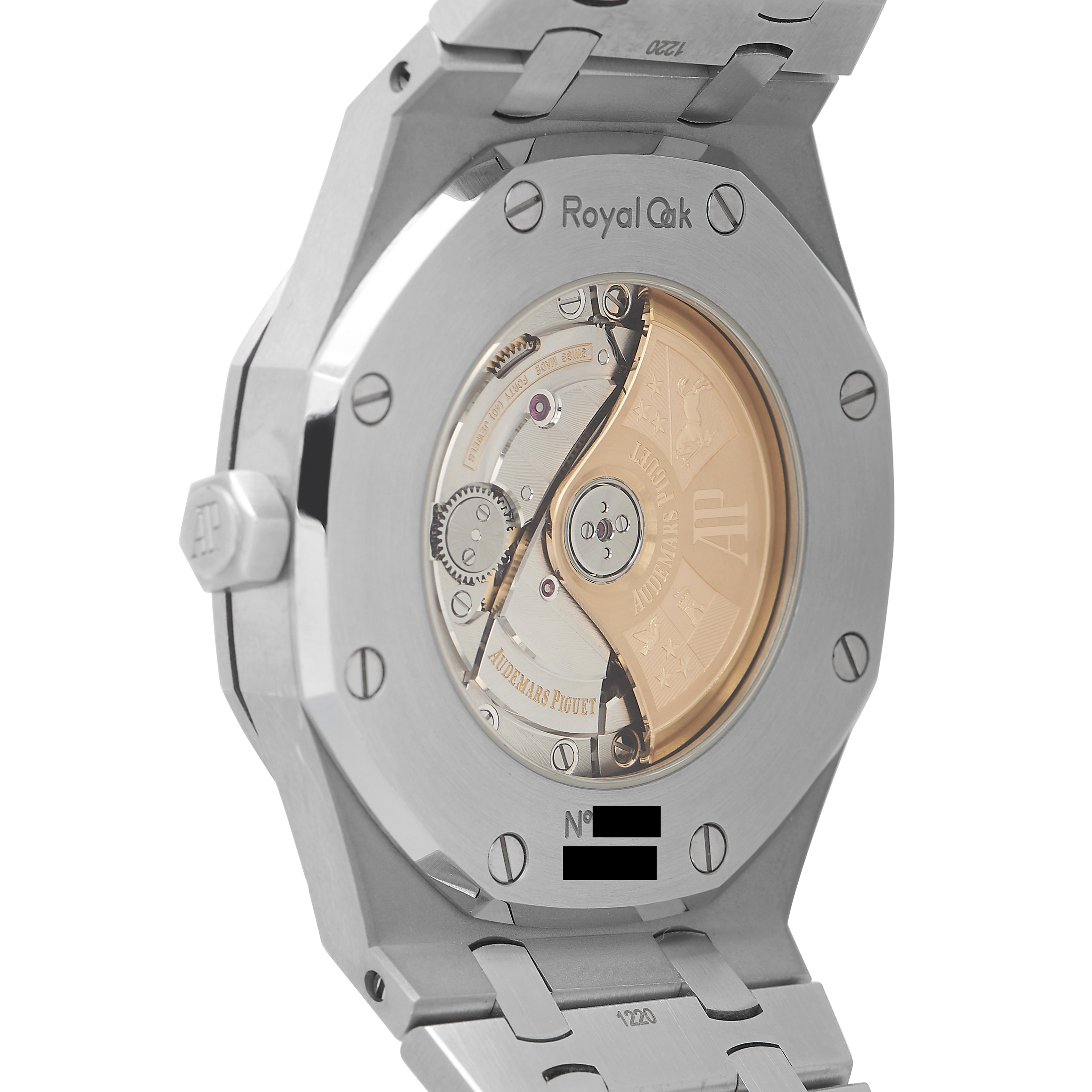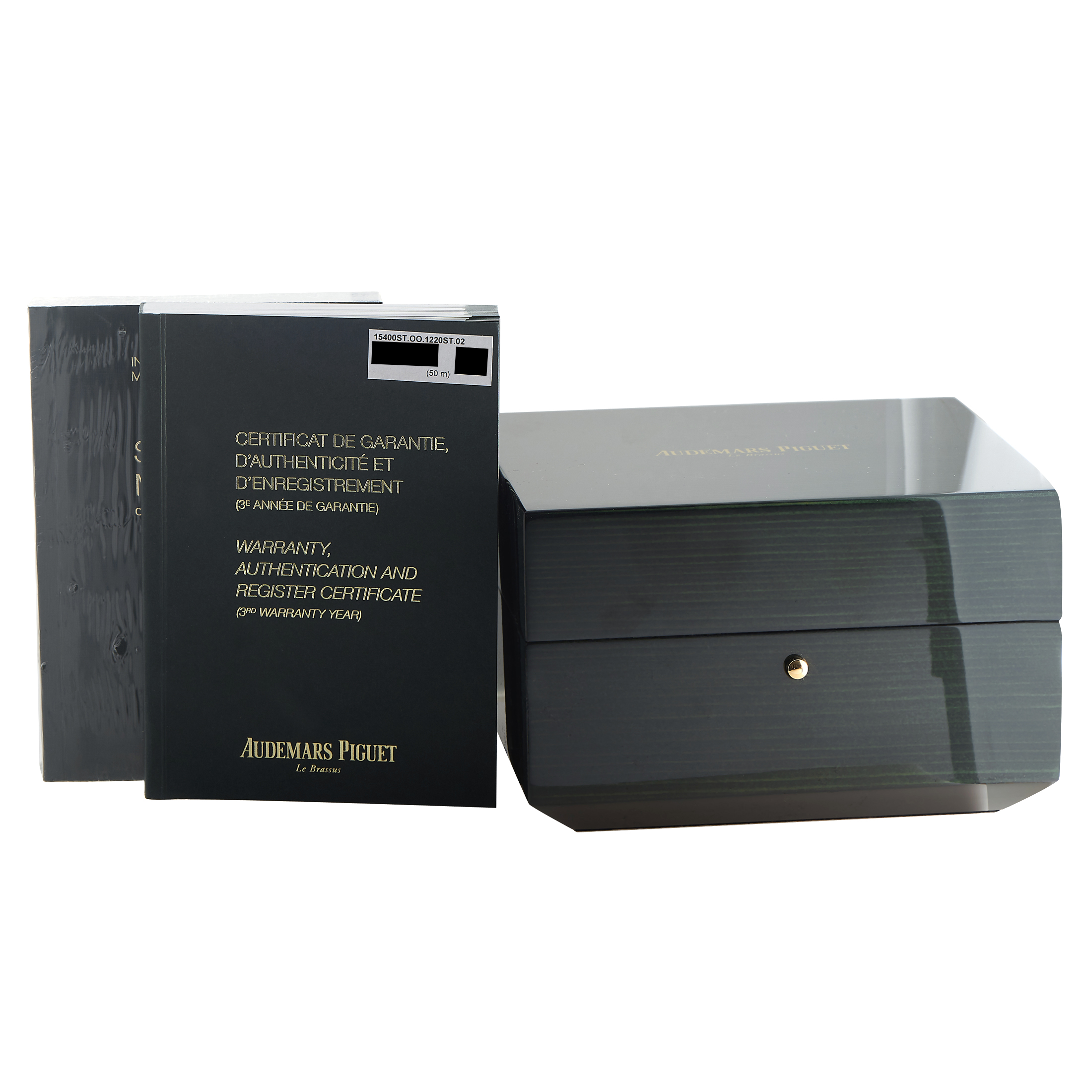 Papers and the manufacturer’s box accompany this pre-owned Audemars Piguet Royal Oak Watch 15400ST.OO.1220ST.02.