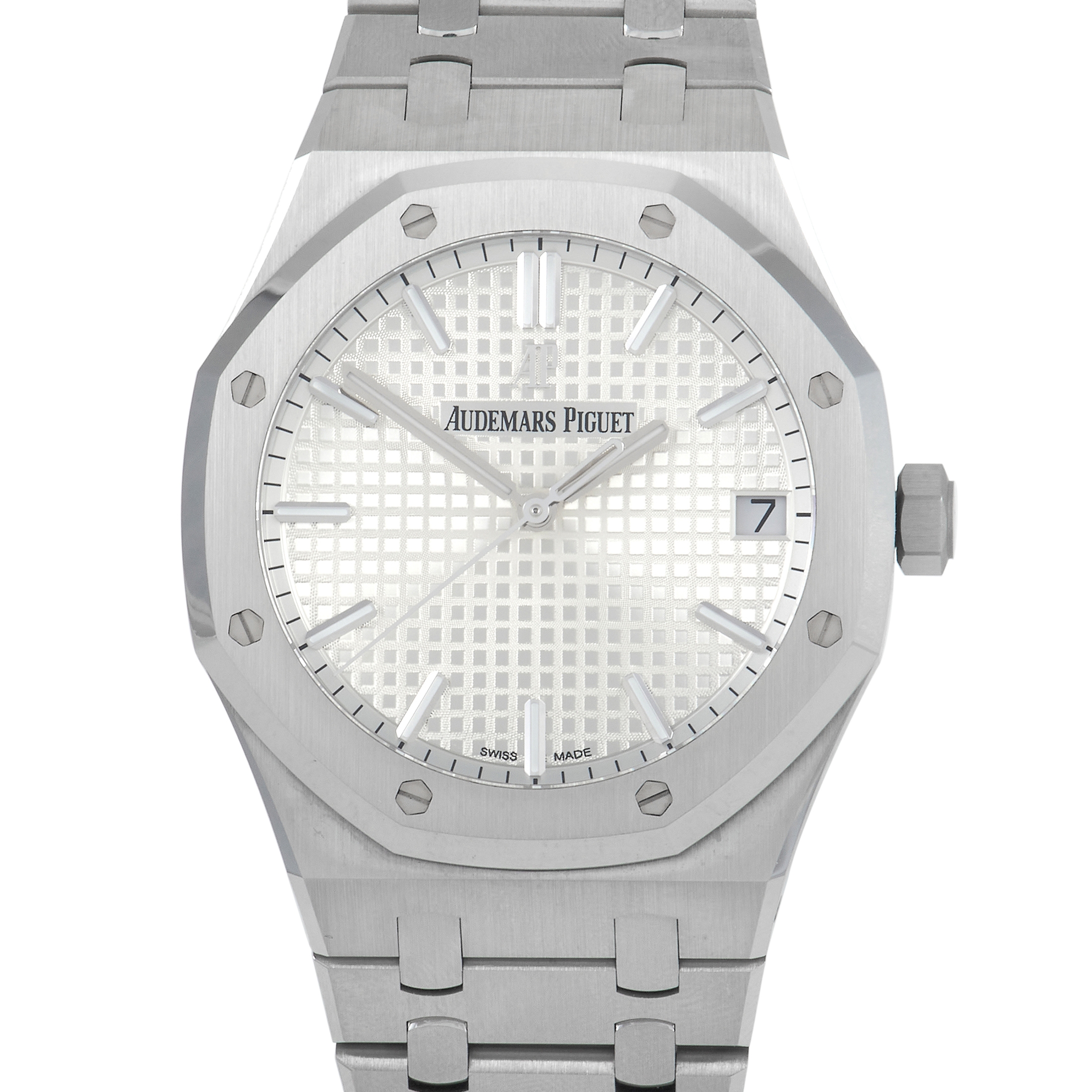 The Royal Oak Silver Dial 15500ST is a 41mm timepiece fashioned from stainless steel and is fitted with a beautiful and comfortable-to-wear bracelet in the same material. The Royal Oak bracelet features a brushed finish on most surfaces except for the polished surface of the angles from the links. The dial is in a silver-white hue with “Grande Tapisserie” pattern. A date wheel in silvery white is present at 3 o’clock position just right next to the smooth and flat minute chapter ring. Also on the dial is the AP logo at 12, Royal Oak hands, and white gold applied indices. Caliber 4302 powers this attractive timepiece. This is a 32-jewel, beautifully-finished movement with 257 components and 70 hours of power reserve. This watch is water resistant up to 50 meters.