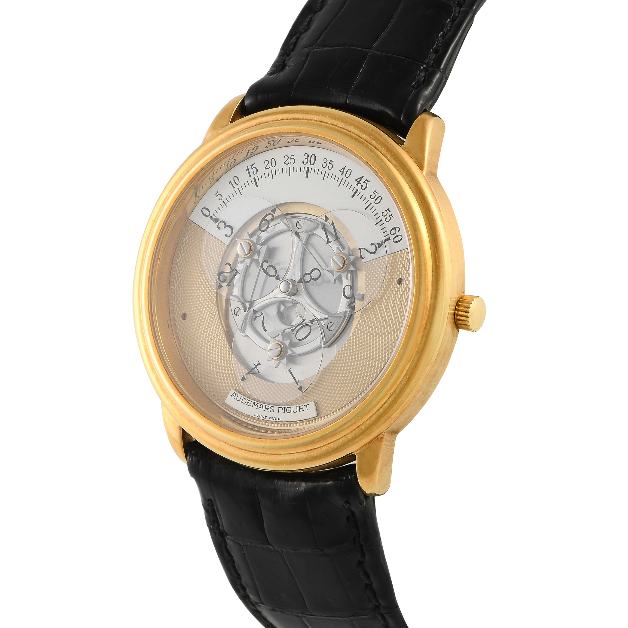 This Audemars Piguet Star Wheel 18K Yellow Gold Automatic Watch 25720BA is offered in pre-owned condition, inclusive of a gift box.