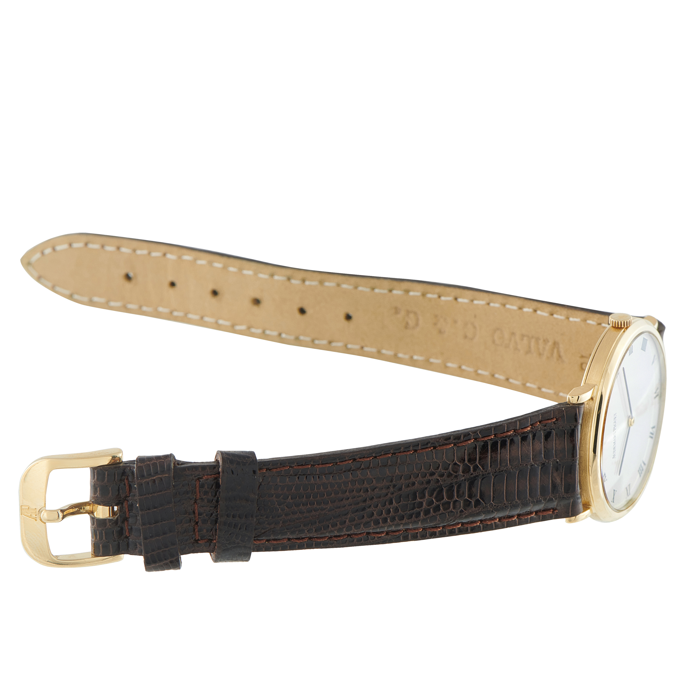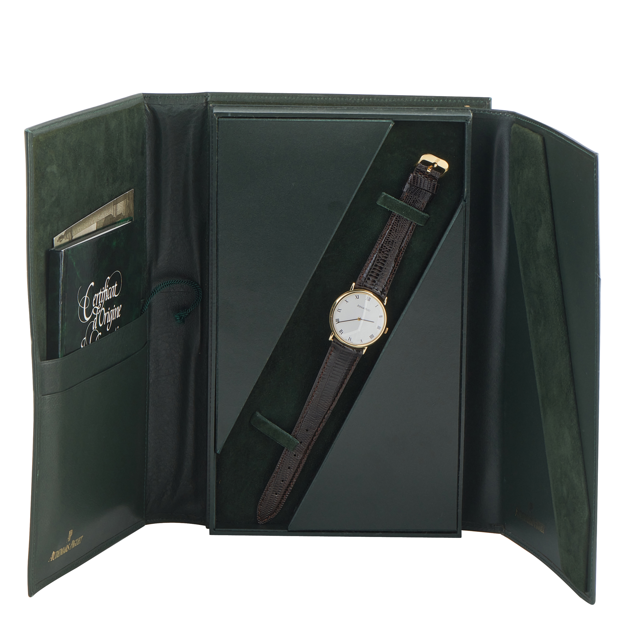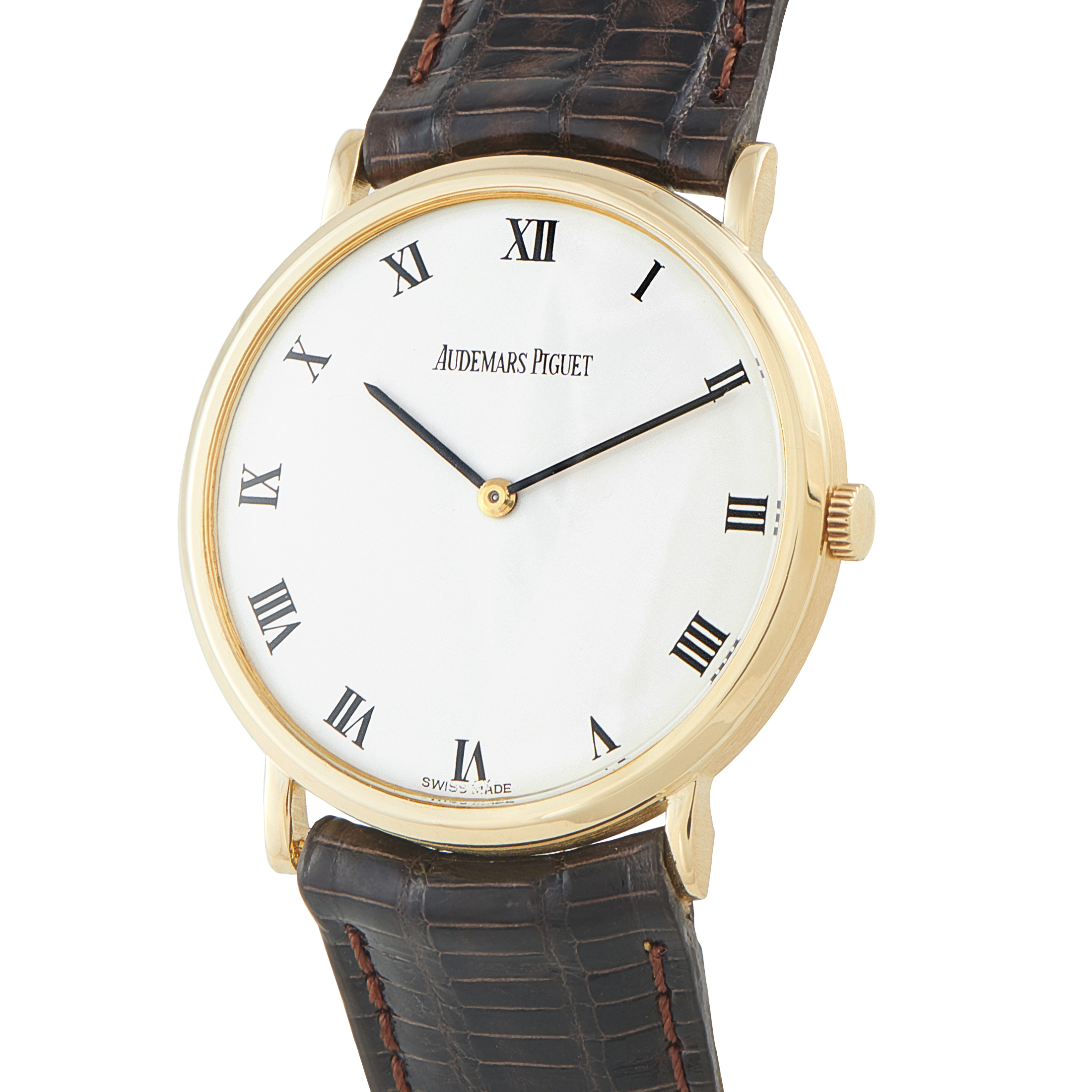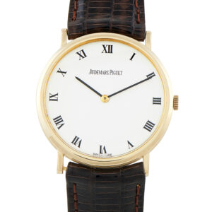 This is Audemars Piguet before spectacle, before scale. This yellow gold dress watch was produced approximately between 1987 and 1994. It has a slim and formal case, sized for an era that valued balance over presence. The white dial is spare and orderly, with black Roman numerals, a pair of slim black hands, and clean printing. Time only. No excess text. Running inside is Caliber 2080, a hand-wound ultra-thin movement with approximately 48 hours of power reserve.