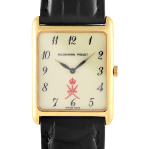 A rare find, this Audemars Piguet ladies’ watch features a charming face on an 18K yellow gold case. The rectangular case measures 26mm x 33mm and is worn on a black leather strap. The dial is made of porcelain, with dauphine hands and retro-style Arabic numeral hour markers. This manually-wound vintage timepiece also bears a red Khanjar symbol, indicating that it’s one of the pieces commissioned by Sultan Qaboos bin Said Al Said.