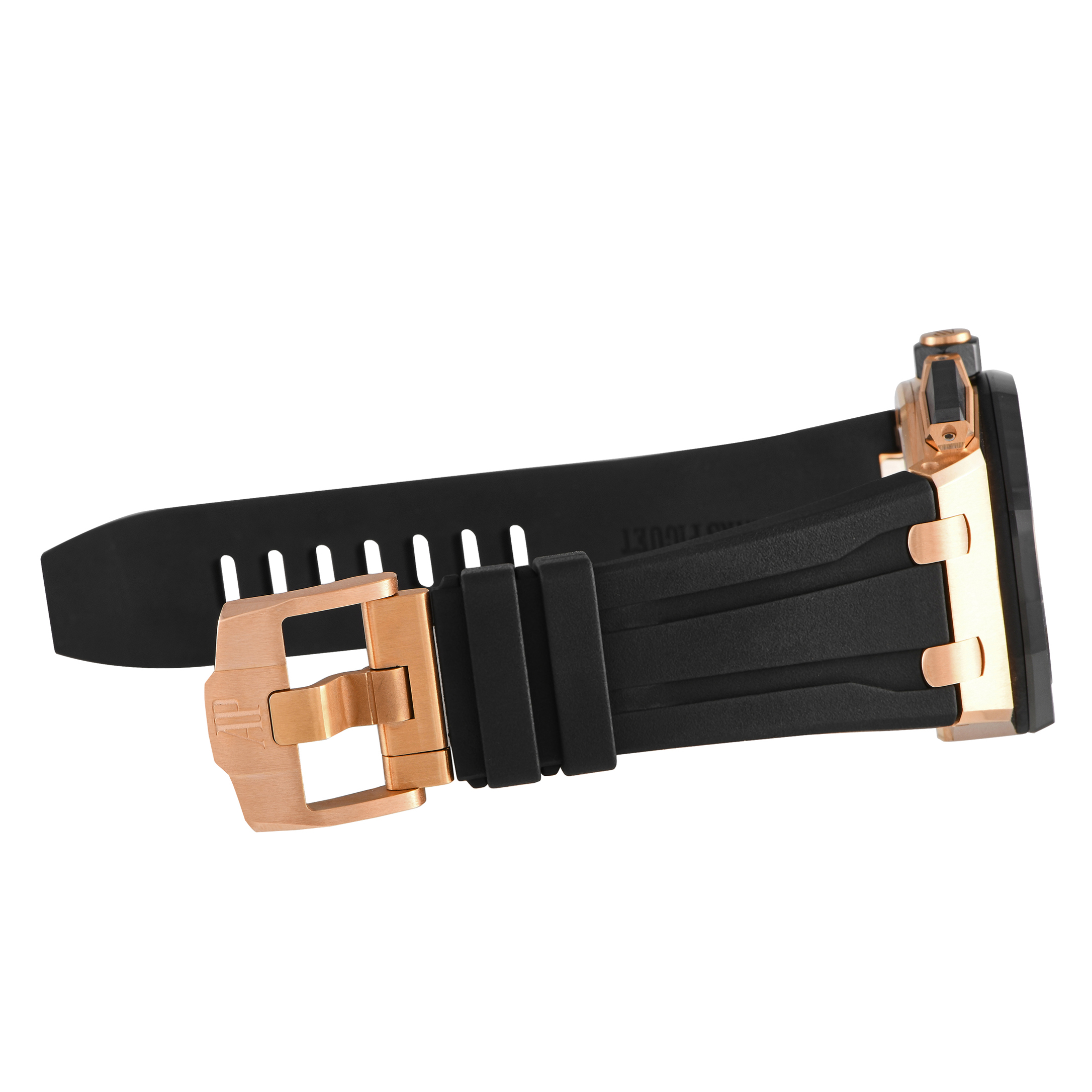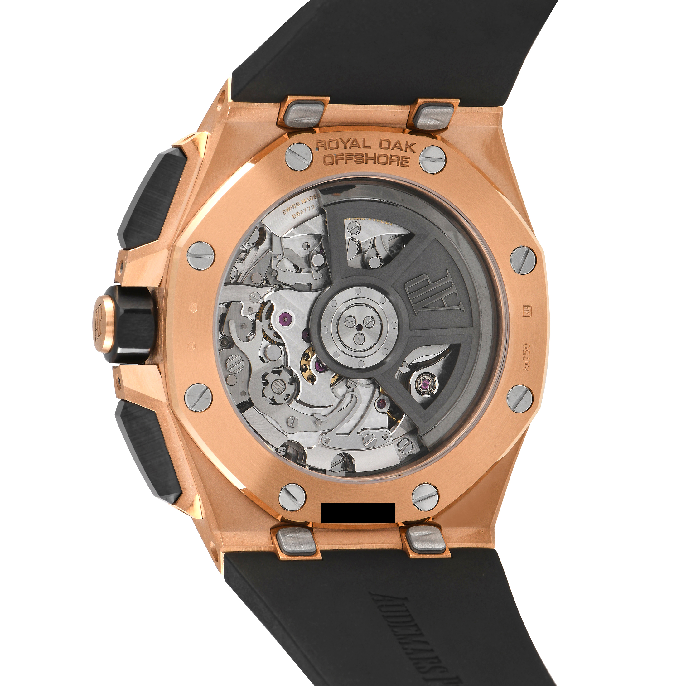 A beautiful Beast. This rose gold and black ceramic Royal Oak Offshore Chronograph has a massive 43mm-wide case worn with a black rubber strap. The watch also features ceramic chronograph pushers and a glareproofed sapphire crystal. Its Méga Tapisserie dial has luminous rose gold index hour markers and hands, three rhodium-toned chronograph counters, and a date window between 4 and 5 o’clock. Inside the case and visible from the transparent case back is the integrated flyback chronograph caliber 4401 that powers the watch. The movement provides 70 hours of power reserve.