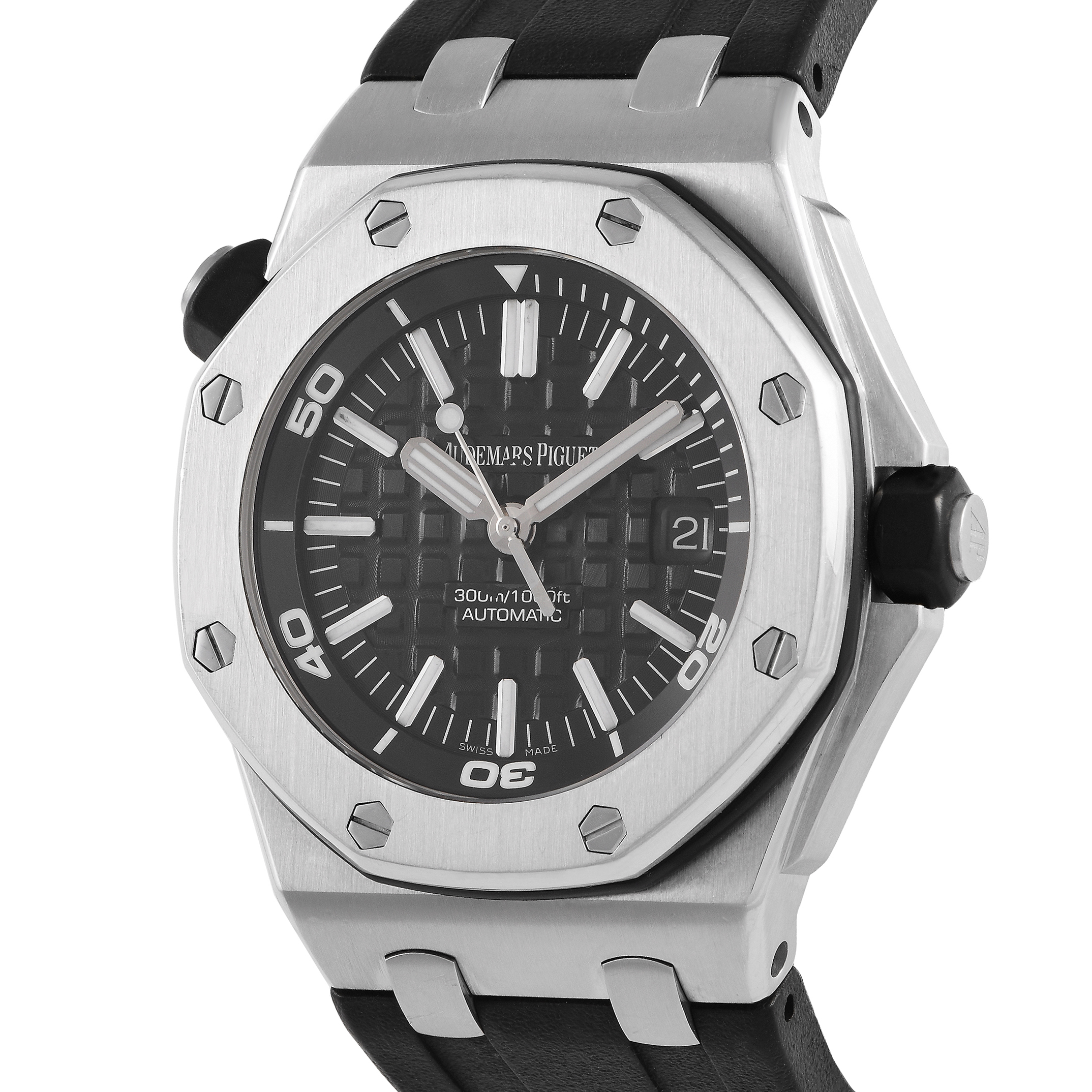 This pre-owned Audemars Piguet Royal Oak Offshore Diver Watch 15703ST.OO.A002CA.01 is accompanied by a gift box.