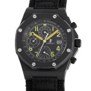 Released in 1997, this limited edition Royal Oak Offshore 25770SN.OO.A001KE.01 was launched in collaboration with Arnold Schwarzenegger who was filming the movie ‘End of Days’ at that time. This particular model was one of the first PVD-coated watches to be ever made. This model, limited to only 500 examples, also features a black Kevlar strap. The case measures 42mm in diameter and is crafted in steel with black PVD coating. The black dial features large and bright yellow Arabic numeral hour markers and hands, plus three sub-dials, and a circular date window at 3 o’clock. The watch is equipped with caliber 2226/2840 self-winding movement with 42 hours of power reserve